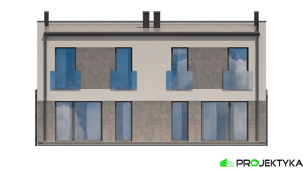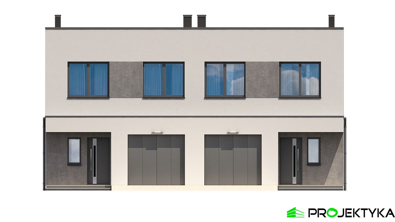 Ka120 to projekt domu w zabudowie bliźniaczej, dwulokalowej lub szeregowej, o łącznej powierzchni mieszkalnej 198,12 m2. Cechuje go minimalistyczny styl zastosowany w technologii murowanej, prosta bryła i funkcjonalność, a to wszystko przykryte płaskim dachem. Z uwagi na to, iż jest to projekt domu piętrowego, doskonale sprawdzi się na niewielkich działkach, o wymiarze minimum 19.24 m x 20.24 m. Każdy z segmentów posiada jednostanowiskowy garaż z pomieszczeniem gospodarczym, usytuowany od strony wejścia. Dolna kondygnacja przeznaczona została na strefę dzienną – hol prowadzi wprost do przestronnego salonu z jadalnią oraz aneksem kuchennym i wyjściem na taras. Na parterze usytuowano również WC. Górna kondygnacja posiada aż cztery sypialnie oraz przestronną łazienkę. Od strony tarasu w projekcie uwzględniono wysokie okna – górne zabezpieczone efektownymi, przeszklonymi balustradami, co doświetla i ożywia wnętrze. Od strony frontowej natomiast dominują tradycyjne, niskie okna, zapewniające maksimum komfortu domownikom. Ten nowoczesny projekt domu jest dedykowany inwestorom poszukującym uniwersalnych, ponadczasowych pomysłów do realizacji.