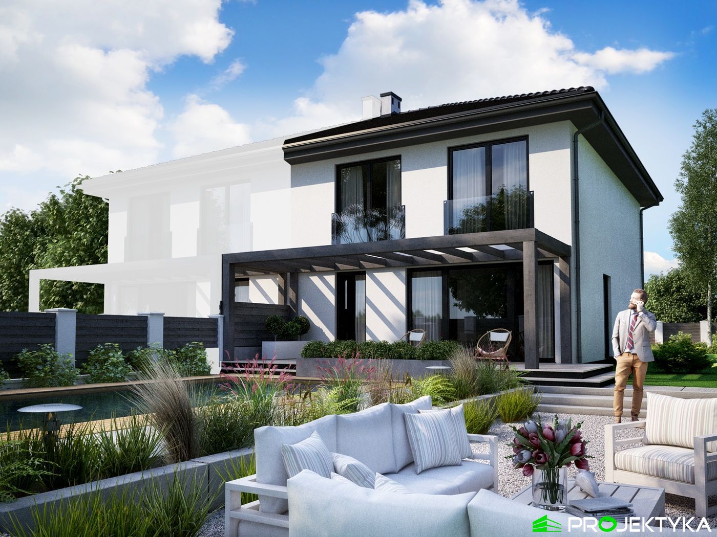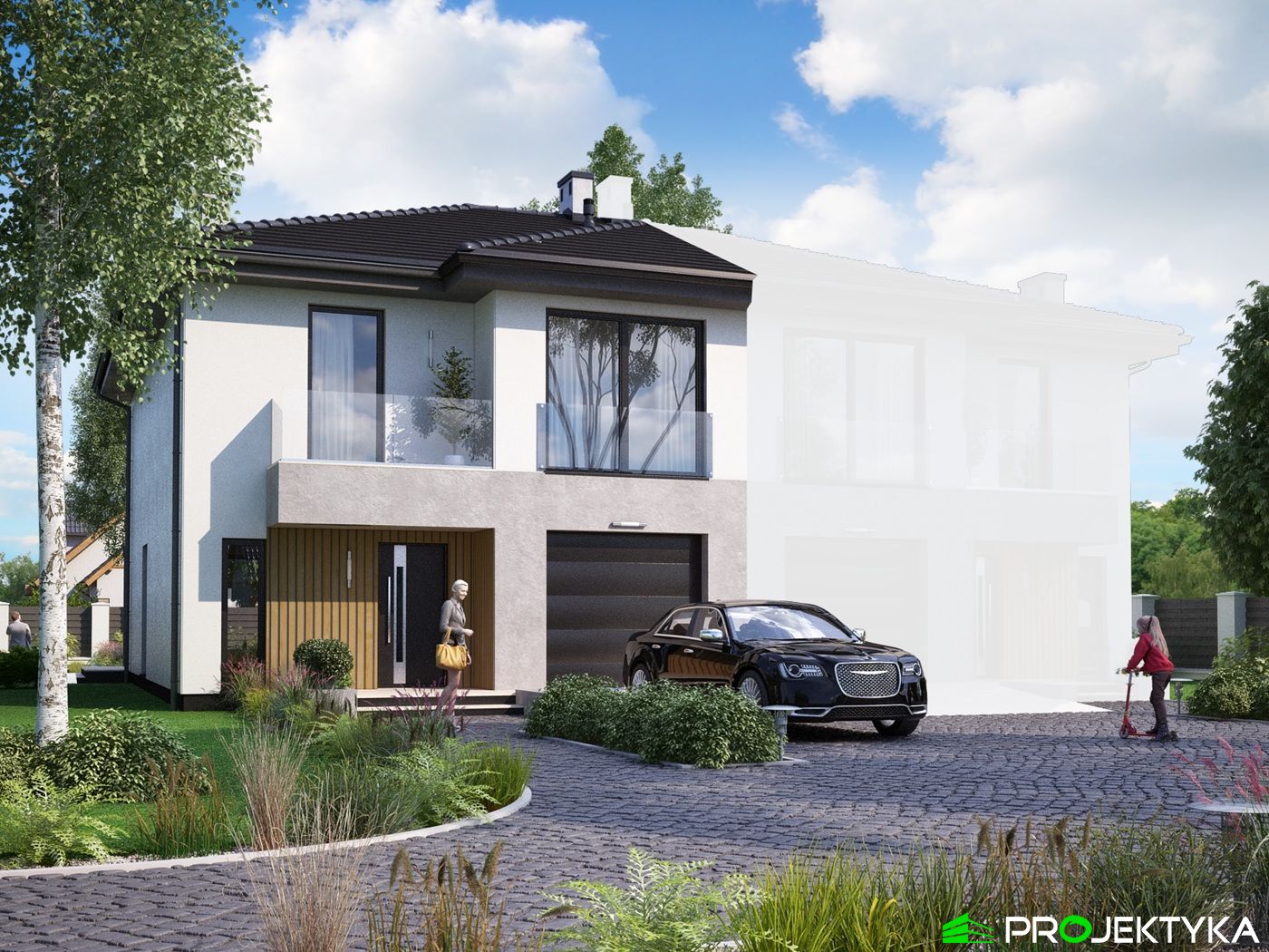 Ka123 war.1 S to projekt domu jednorodzinnego do zbliźniaczenia. Jest to dom piętrowy pokryty wielospadowym dachem, idealny dla dużych rodzin z uwagi na powierzchnię użytkową wynoszącą aż 150.27 m2. Gotowy projekt domu piętrowego wybudowany został w stylu nowoczesnym w technologii murowanej. Dach pokryto blachodachówką, a wysokie okna górnej kondygnacji zostały zabezpieczone efektownymi szklanymi balustradami. Na tylnej części domu uwzględniono przestronny taras, a w jednej z sypialni od frontu znajduje się dodatkowy niewielki balkon. Na dolnej kondygnacji znajduje się jednostanowiskowy garaż zlokalizowany od frontu, niewielkie pomieszczenie gospodarcze oraz łazienka z WC. W dalszej części domu na parterze umieszczono przestronną strefę dzienną – salon z jadalnią oraz kuchnię. Na górnej kondygnacji zaaranżowano typową strefę nocną, na którą składają się cztery duże sypialnie, łazienka oraz garderoba. W salonie uwzględniono ogrzewanie kominkowe, które wprowadzi do domu niezwykły klimat.