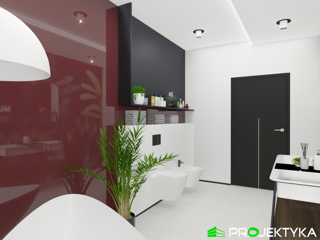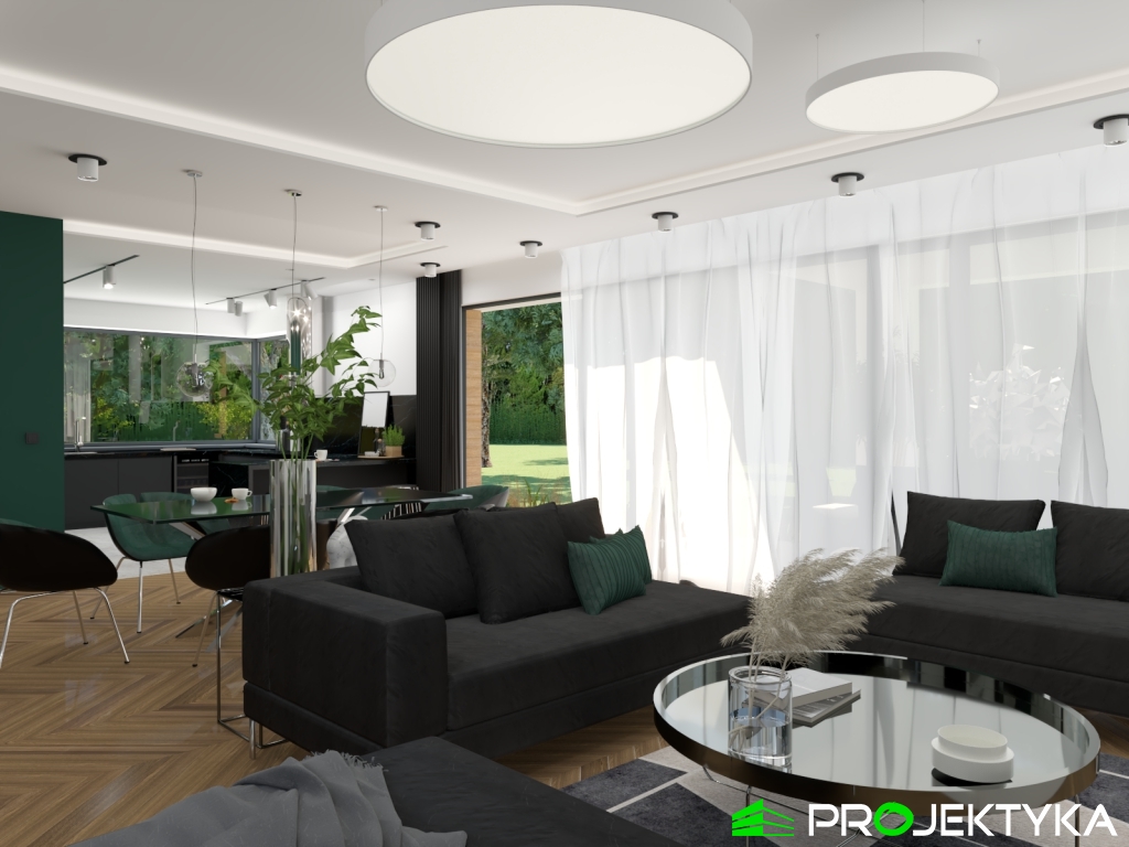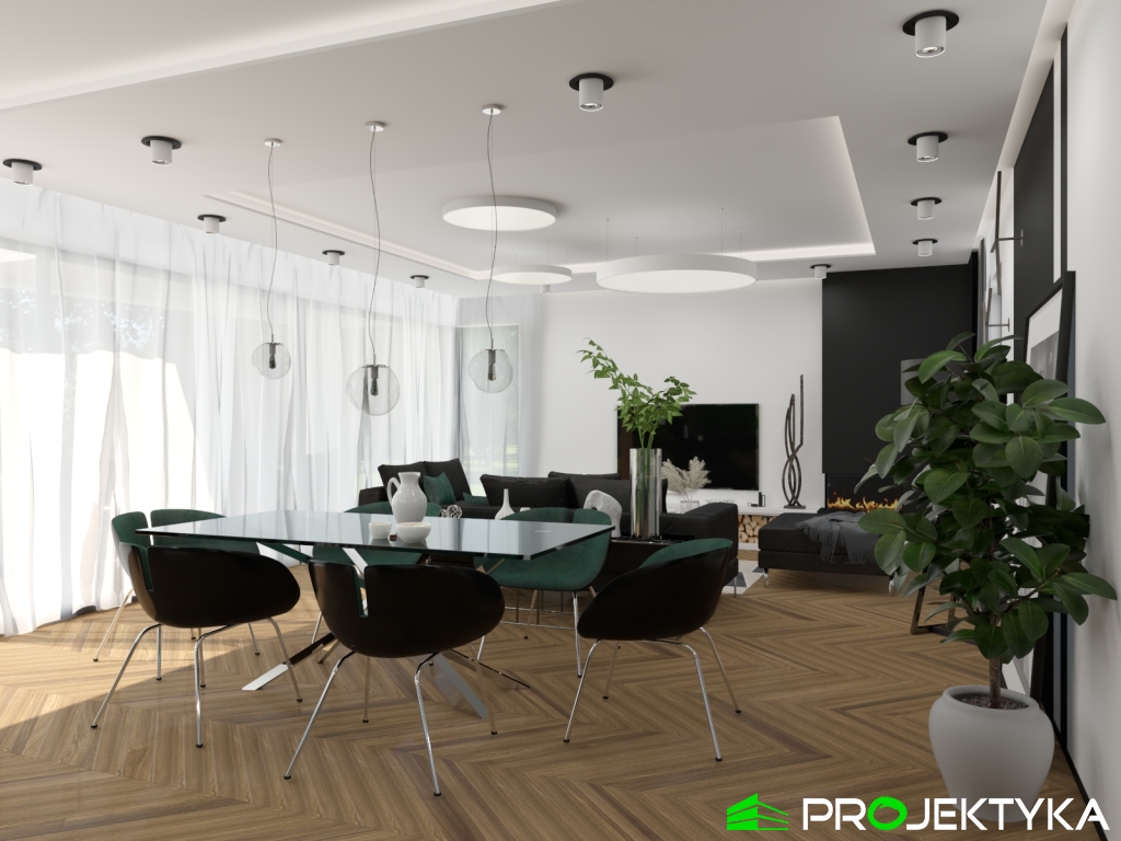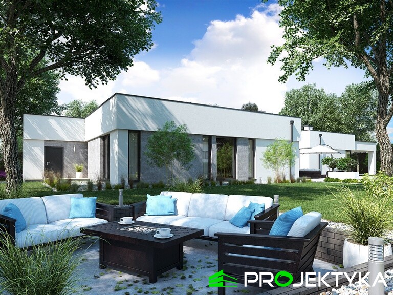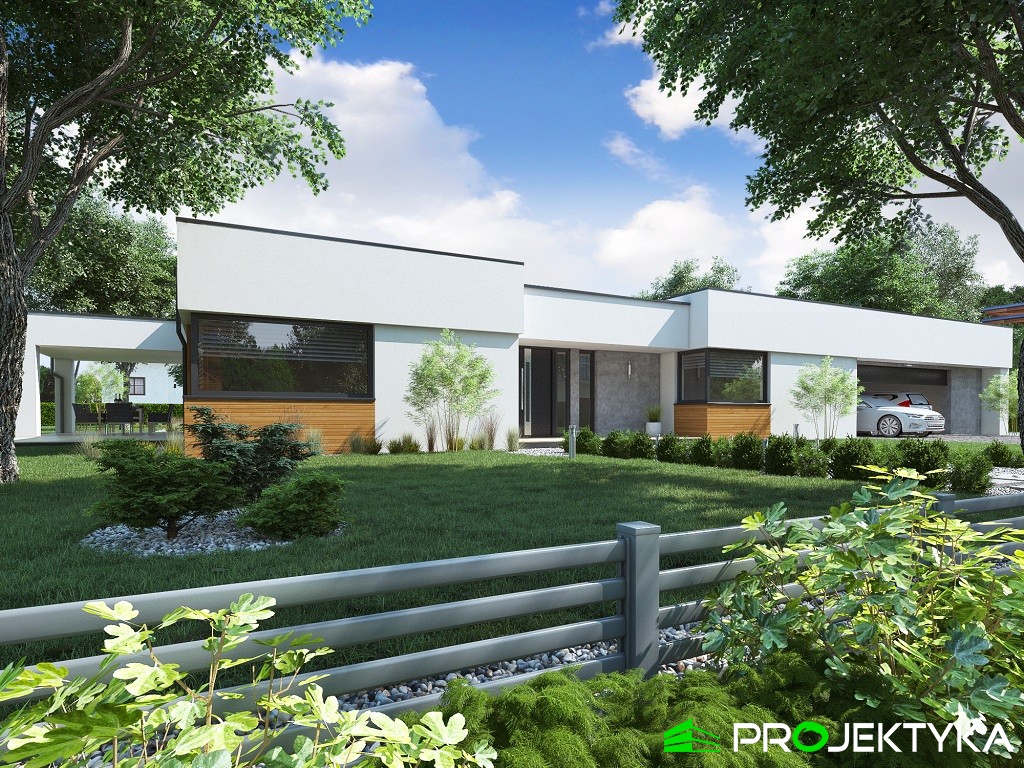 Ka150 M jest imponującym projektem domu parterowego w stylu nowoczesnym. Budynek przykryto dachem płaskim, natomiast wykonany został w technologii murowanej. Jego powierzchnia mieszkalna wynosi aż 229.29 m2, co sprawia, że będzie idealnym miejscem dla dużej rodziny. Dwustanowiskowy garaż łączy się z dwoma pomieszczeniami gospodarczymi. Dodatkowa można do niego wejść z korytarza wewnątrz domu. W lewej części domu znajduje się kuchnia z wydzieloną spiżarnia, jadalnia oraz przestronny salon połączony przeszkloną ścianą z dużym tarasem. Dodatkowy taras z tyłu domu, będzie idealnym miejscem na rozpoczęcia dnia, ponieważ mają do niego sypialnie. Ciąg komunikacyjny w kształcie litery L prowadzi do strefy nocnej składającej się z czterech sypialni, gabinetu, pralni, łazienki oraz WC. Dużym atutem tego projektu jest spora garderoba zlokalizowana przy wejściu, która dostępna jest z wiatrołapu. Wysokie okna sprawiają, że ten gotowy projekt domu parterowego gwarantuje dostęp do światła słonecznego przez cały dzień, o każdej porze roku!