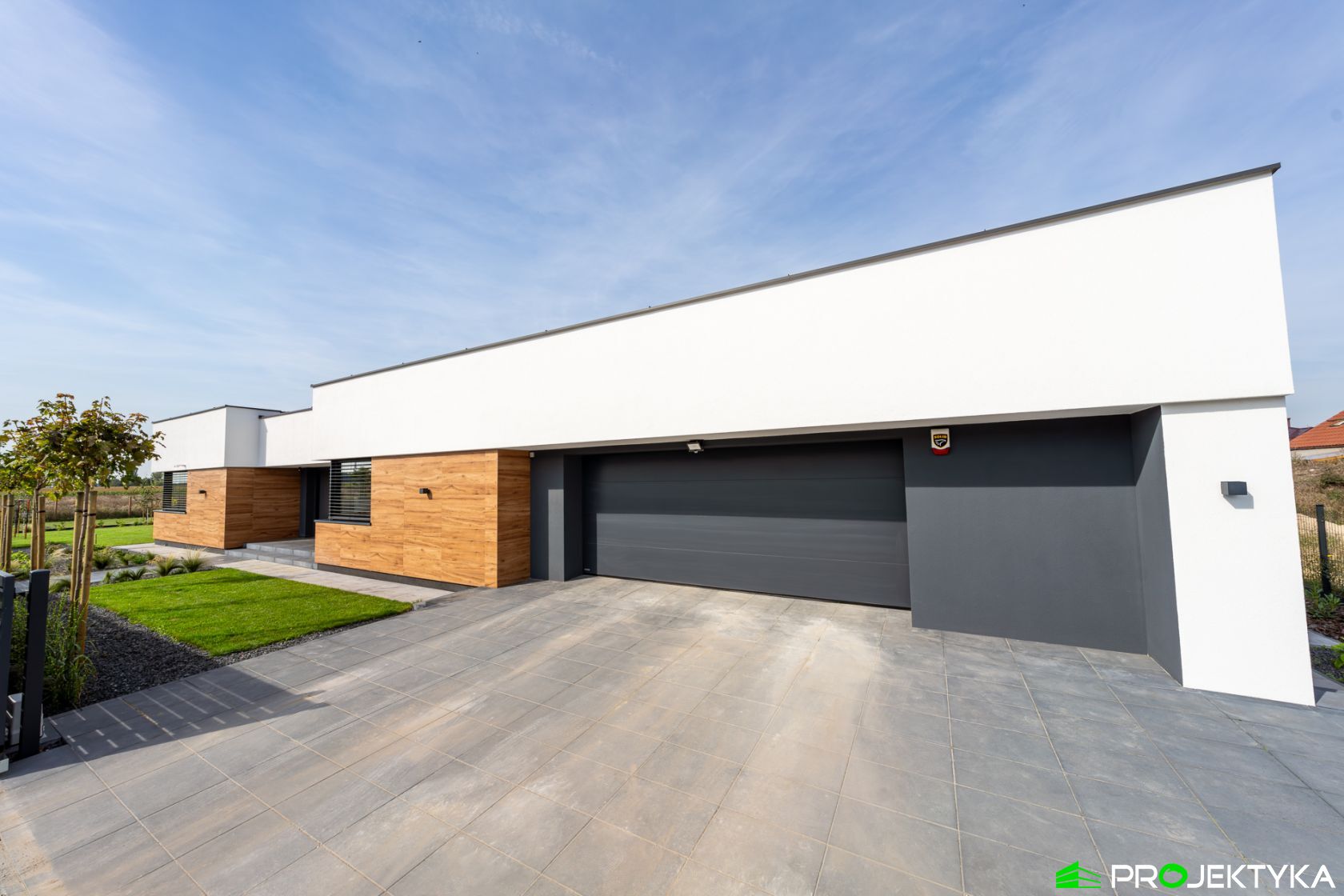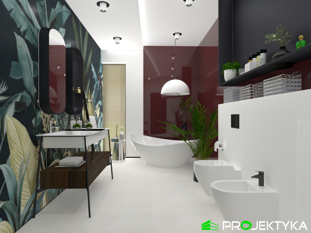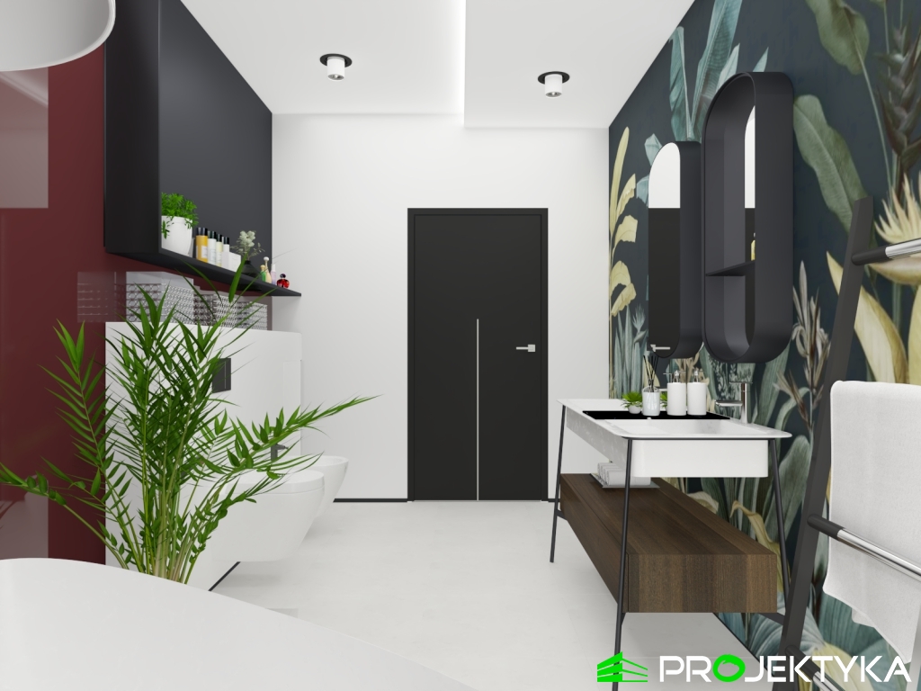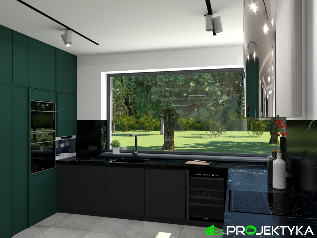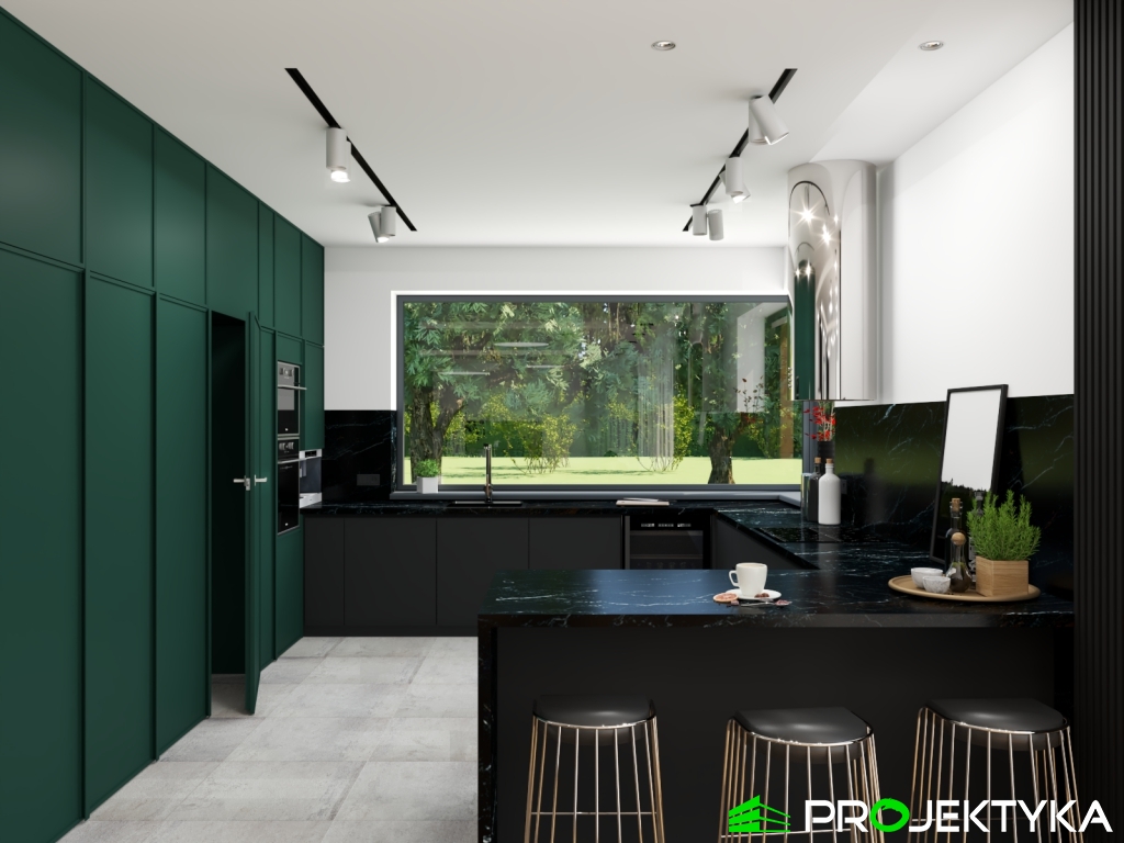 Ka150 M jest imponującym projektem domu parterowego w stylu nowoczesnym. Budynek przykryto dachem płaskim, natomiast wykonany został w technologii murowanej. Jego powierzchnia mieszkalna wynosi aż 229.29 m2, co sprawia, że będzie idealnym miejscem dla dużej rodziny. Dwustanowiskowy garaż łączy się z dwoma pomieszczeniami gospodarczymi. Dodatkowa można do niego wejść z korytarza wewnątrz domu. W lewej części domu znajduje się kuchnia z wydzieloną spiżarnia, jadalnia oraz przestronny salon połączony przeszkloną ścianą z dużym tarasem. Dodatkowy taras z tyłu domu, będzie idealnym miejscem na rozpoczęcia dnia, ponieważ mają do niego sypialnie. Ciąg komunikacyjny w kształcie litery L prowadzi do strefy nocnej składającej się z czterech sypialni, gabinetu, pralni, łazienki oraz WC. Dużym atutem tego projektu jest spora garderoba zlokalizowana przy wejściu, która dostępna jest z wiatrołapu. Wysokie okna sprawiają, że ten gotowy projekt domu parterowego gwarantuje dostęp do światła słonecznego przez cały dzień, o każdej porze roku!