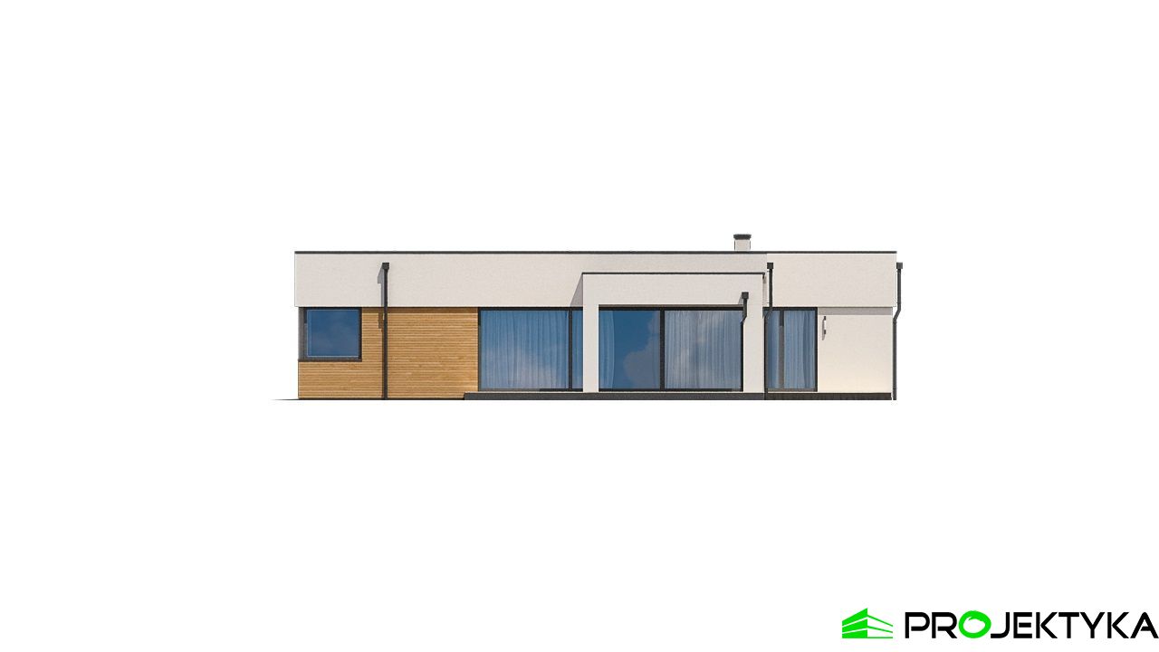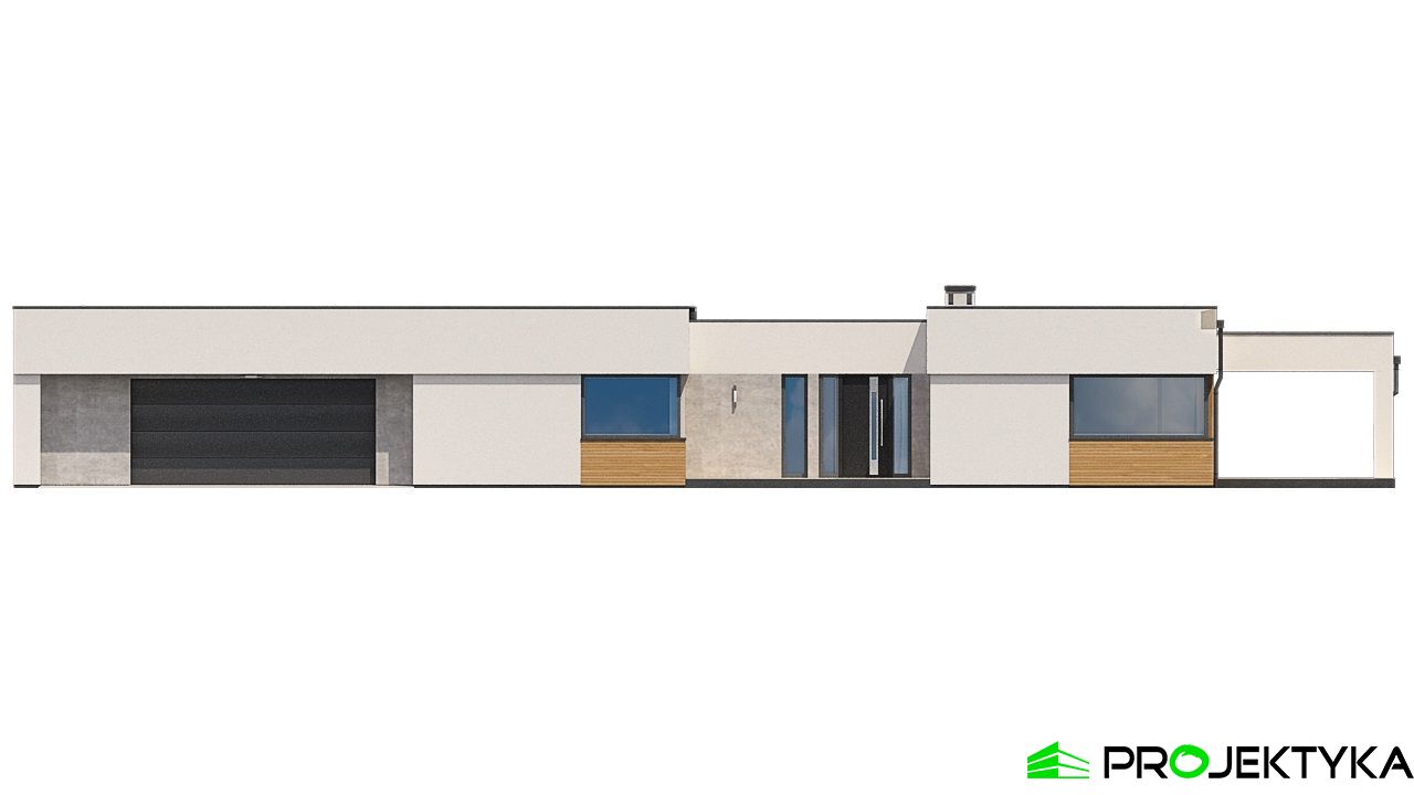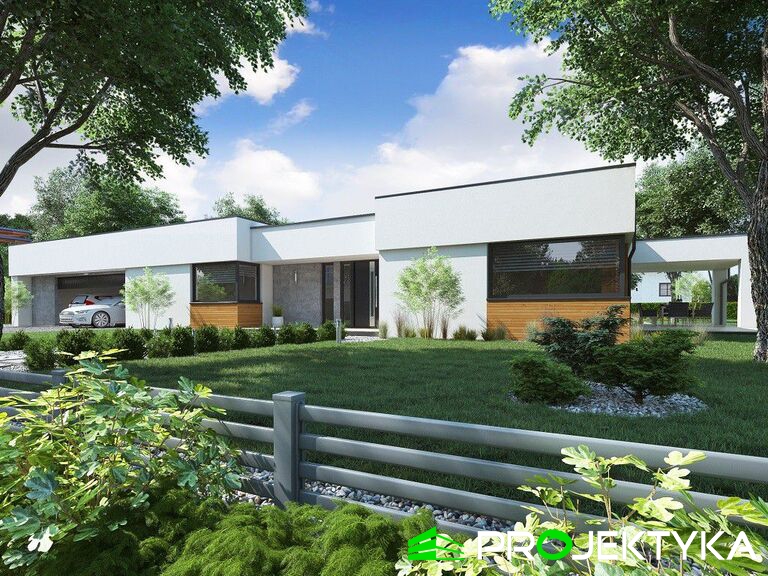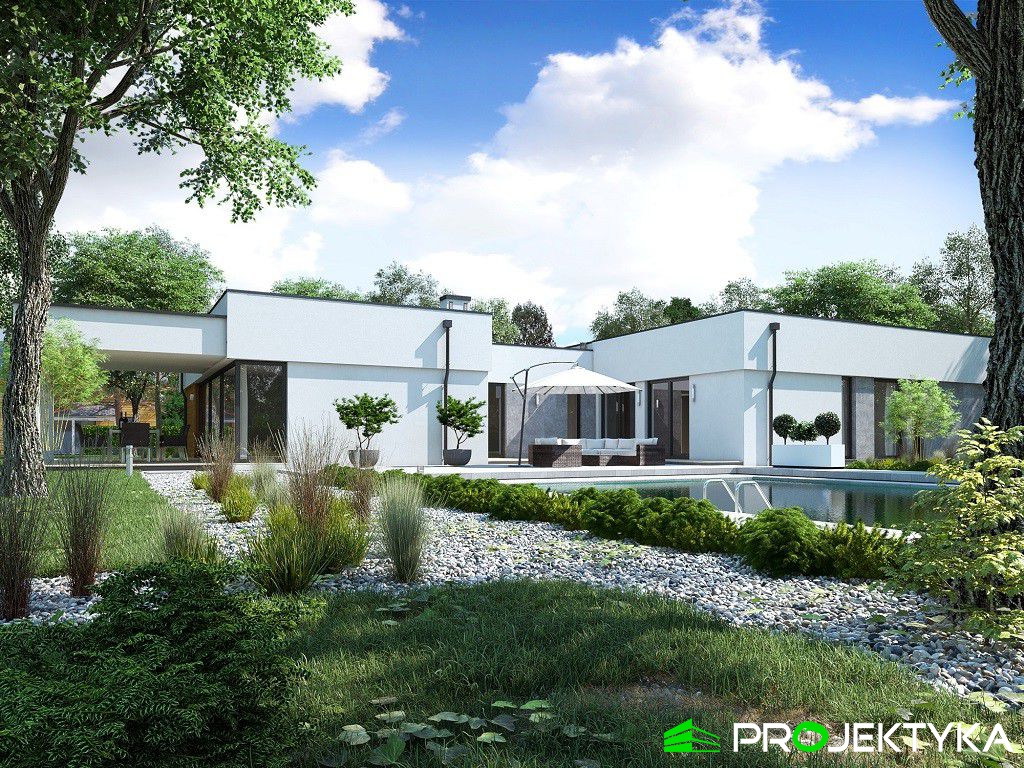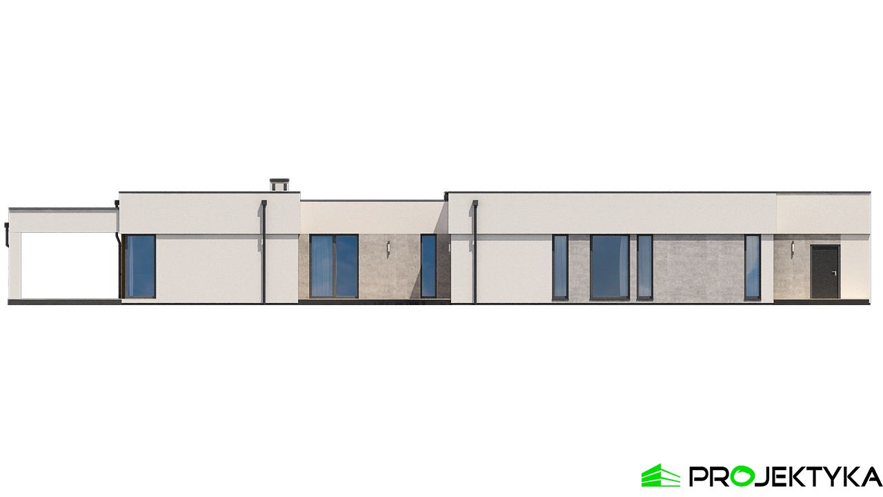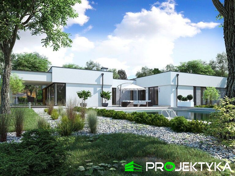 Ka150 M jest imponującym projektem domu parterowego w stylu nowoczesnym. Budynek przykryto dachem płaskim, natomiast wykonany został w technologii murowanej. Jego powierzchnia mieszkalna wynosi aż 229.29 m2, co sprawia, że będzie idealnym miejscem dla dużej rodziny. Dwustanowiskowy garaż łączy się z dwoma pomieszczeniami gospodarczymi. Dodatkowa można do niego wejść z korytarza wewnątrz domu. W lewej części domu znajduje się kuchnia z wydzieloną spiżarnia, jadalnia oraz przestronny salon połączony przeszkloną ścianą z dużym tarasem. Dodatkowy taras z tyłu domu, będzie idealnym miejscem na rozpoczęcia dnia, ponieważ mają do niego sypialnie. Ciąg komunikacyjny w kształcie litery L prowadzi do strefy nocnej składającej się z czterech sypialni, gabinetu, pralni, łazienki oraz WC. Dużym atutem tego projektu jest spora garderoba zlokalizowana przy wejściu, która dostępna jest z wiatrołapu. Wysokie okna sprawiają, że ten gotowy projekt domu parterowego gwarantuje dostęp do światła słonecznego przez cały dzień, o każdej porze roku!