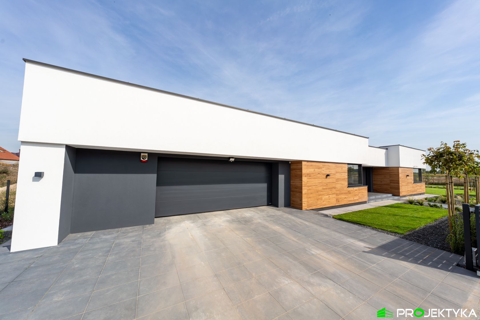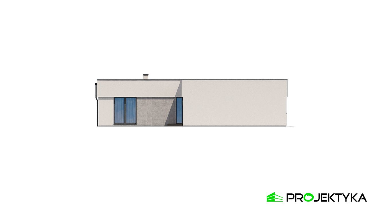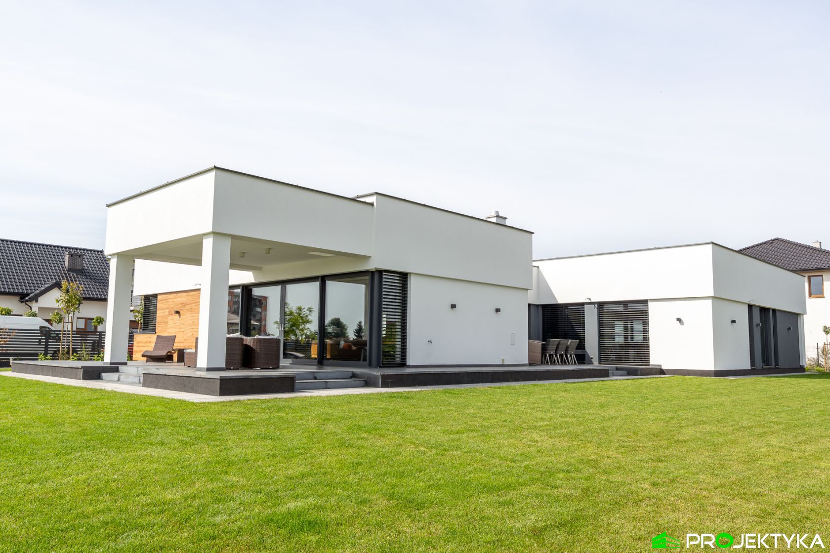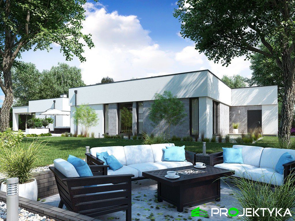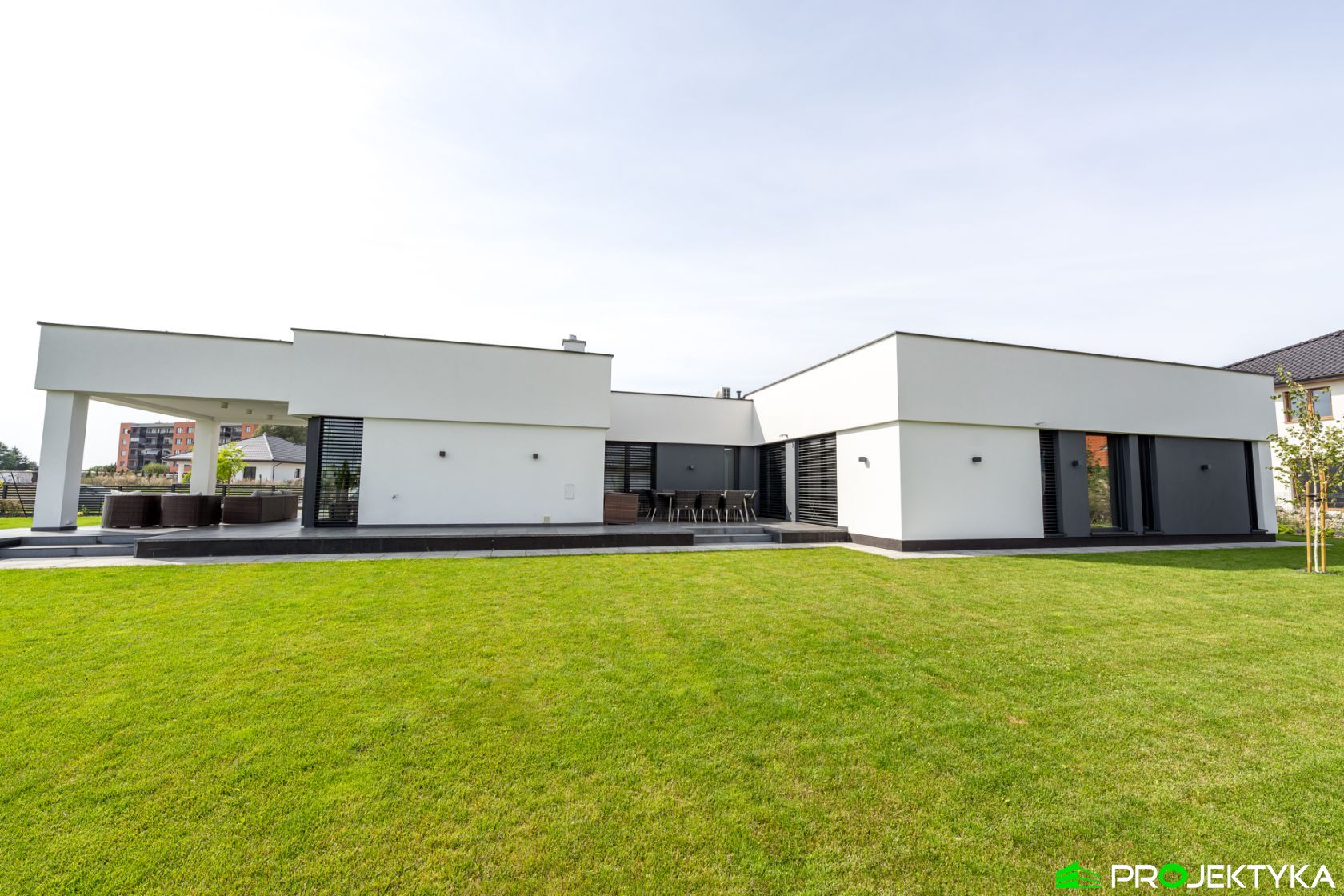 Ka150 M jest imponującym projektem domu parterowego w stylu nowoczesnym. Budynek przykryto dachem płaskim, natomiast wykonany został w technologii murowanej. Jego powierzchnia mieszkalna wynosi aż 229.29 m2, co sprawia, że będzie idealnym miejscem dla dużej rodziny. Dwustanowiskowy garaż łączy się z dwoma pomieszczeniami gospodarczymi. Dodatkowa można do niego wejść z korytarza wewnątrz domu. W lewej części domu znajduje się kuchnia z wydzieloną spiżarnia, jadalnia oraz przestronny salon połączony przeszkloną ścianą z dużym tarasem. Dodatkowy taras z tyłu domu, będzie idealnym miejscem na rozpoczęcia dnia, ponieważ mają do niego sypialnie. Ciąg komunikacyjny w kształcie litery L prowadzi do strefy nocnej składającej się z czterech sypialni, gabinetu, pralni, łazienki oraz WC. Dużym atutem tego projektu jest spora garderoba zlokalizowana przy wejściu, która dostępna jest z wiatrołapu. Wysokie okna sprawiają, że ten gotowy projekt domu parterowego gwarantuje dostęp do światła słonecznego przez cały dzień, o każdej porze roku!