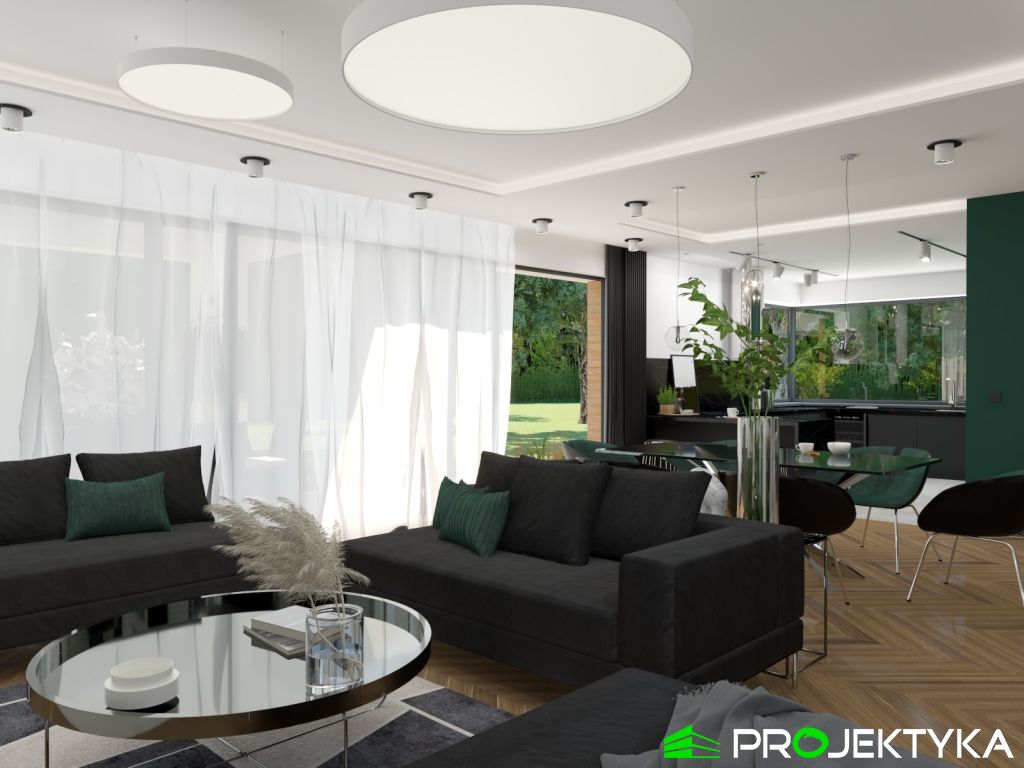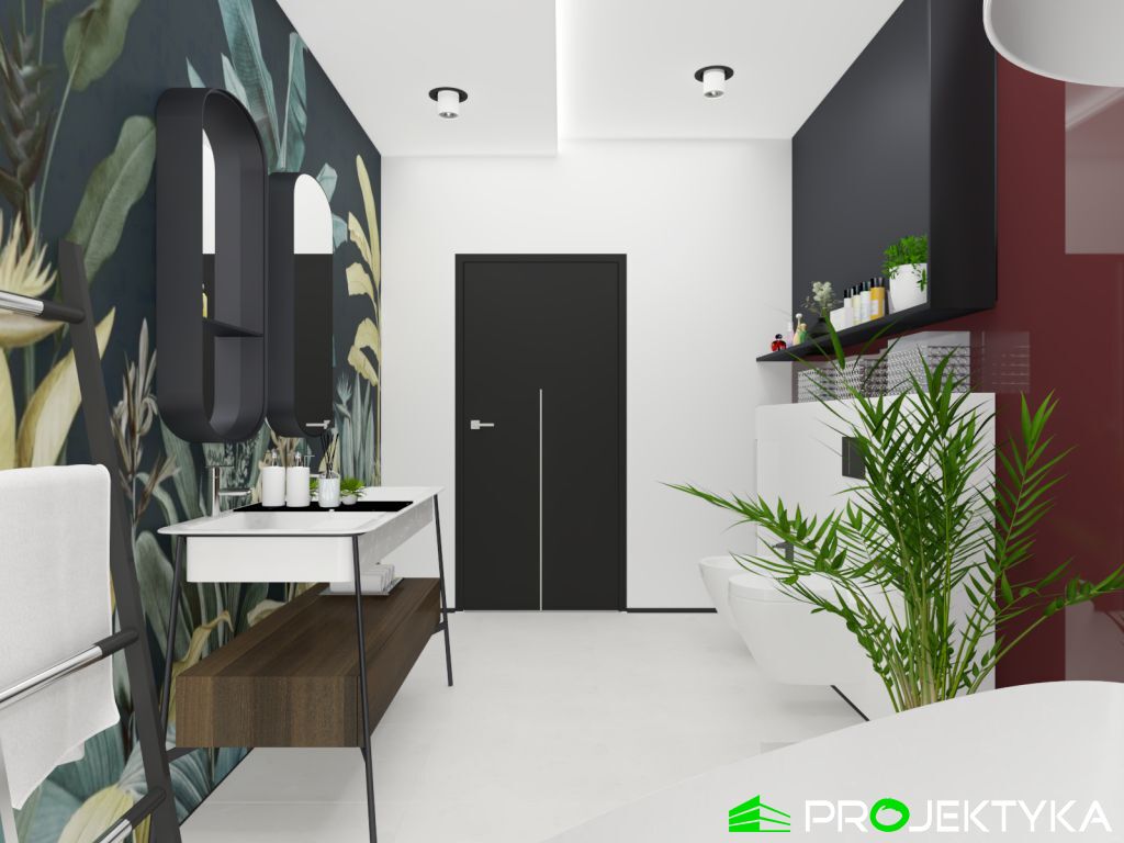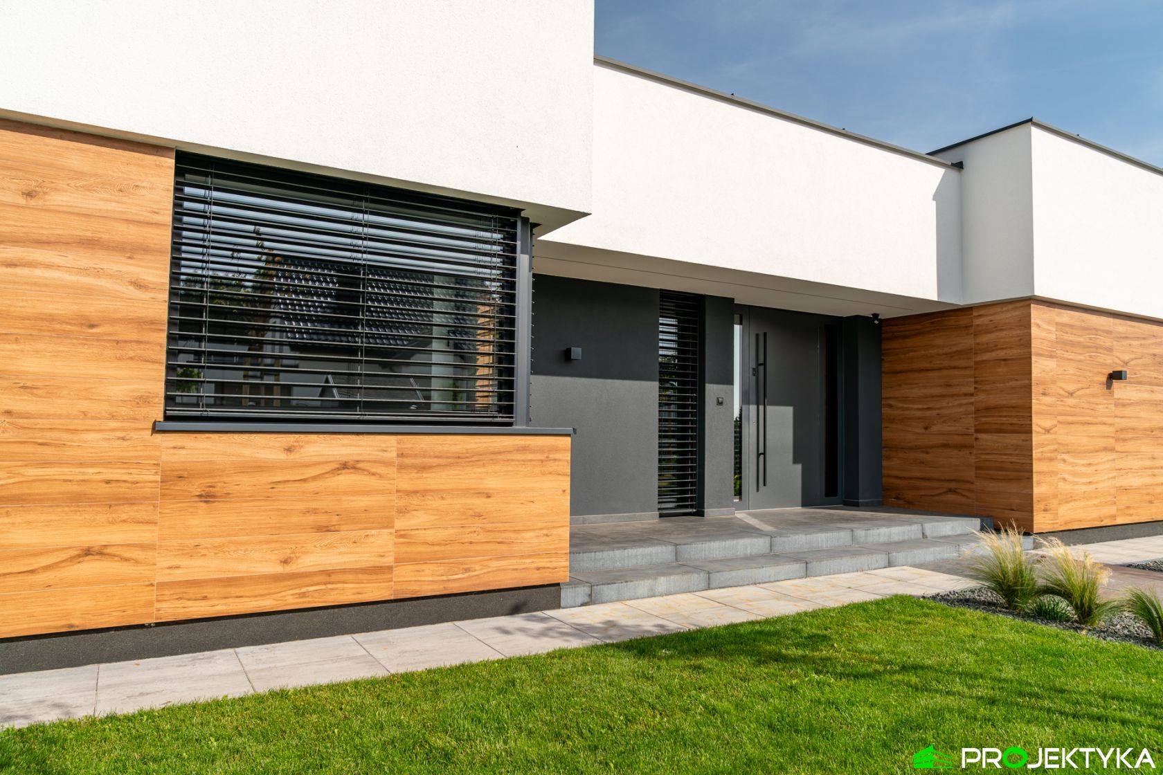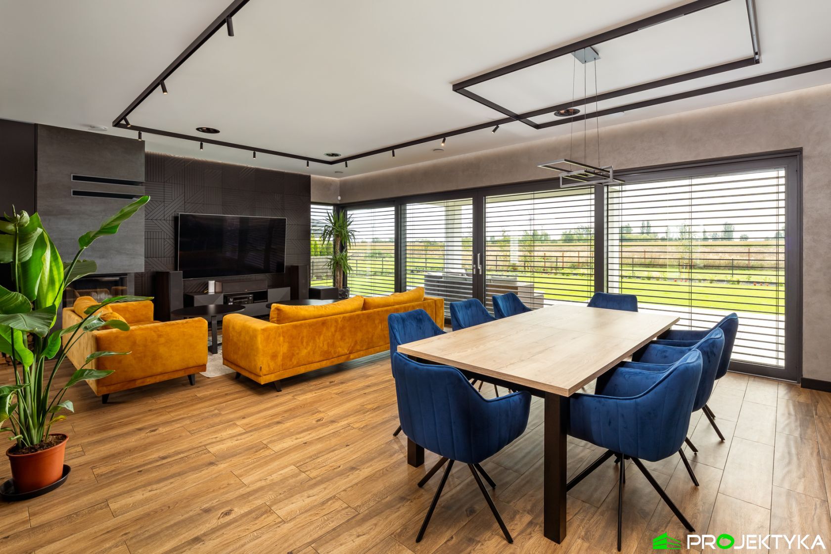 Ka150 M jest imponującym projektem domu parterowego w stylu nowoczesnym. Budynek przykryto dachem płaskim, natomiast wykonany został w technologii murowanej. Jego powierzchnia mieszkalna wynosi aż 229.29 m2, co sprawia, że będzie idealnym miejscem dla dużej rodziny. Dwustanowiskowy garaż łączy się z dwoma pomieszczeniami gospodarczymi. Dodatkowa można do niego wejść z korytarza wewnątrz domu. W lewej części domu znajduje się kuchnia z wydzieloną spiżarnia, jadalnia oraz przestronny salon połączony przeszkloną ścianą z dużym tarasem. Dodatkowy taras z tyłu domu, będzie idealnym miejscem na rozpoczęcia dnia, ponieważ mają do niego sypialnie. Ciąg komunikacyjny w kształcie litery L prowadzi do strefy nocnej składającej się z czterech sypialni, gabinetu, pralni, łazienki oraz WC. Dużym atutem tego projektu jest spora garderoba zlokalizowana przy wejściu, która dostępna jest z wiatrołapu. Wysokie okna sprawiają, że ten gotowy projekt domu parterowego gwarantuje dostęp do światła słonecznego przez cały dzień, o każdej porze roku!