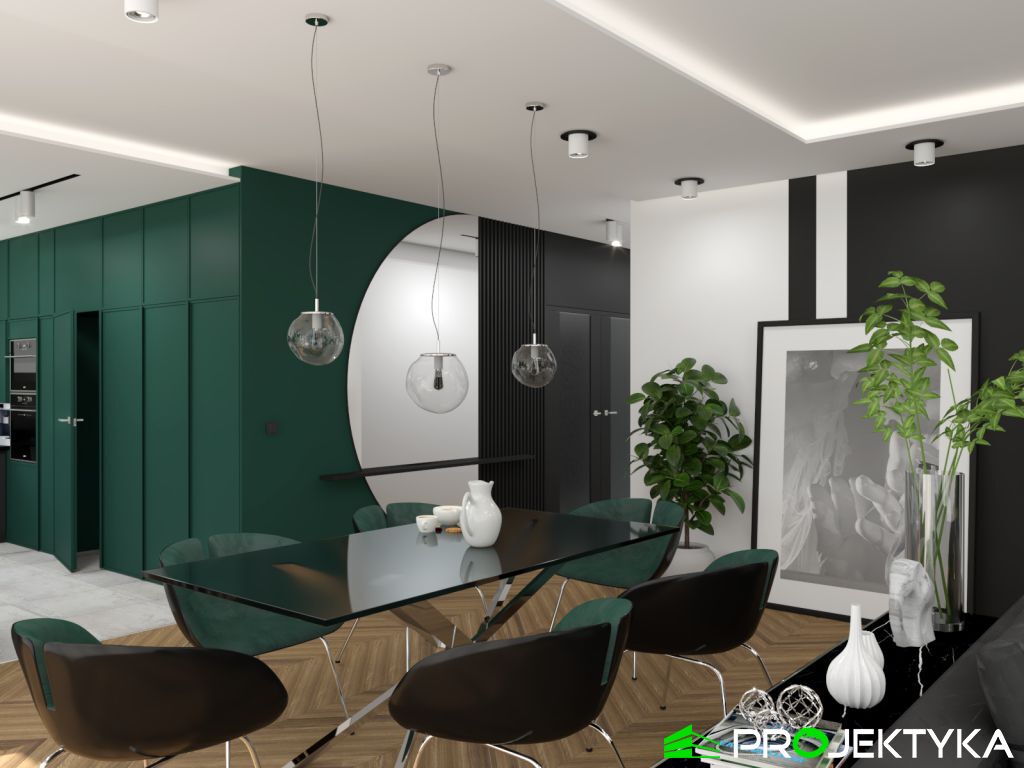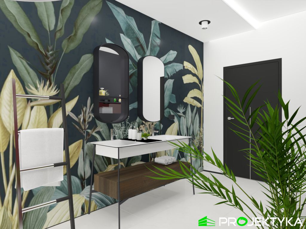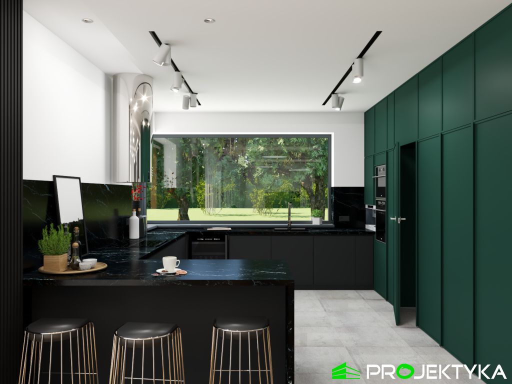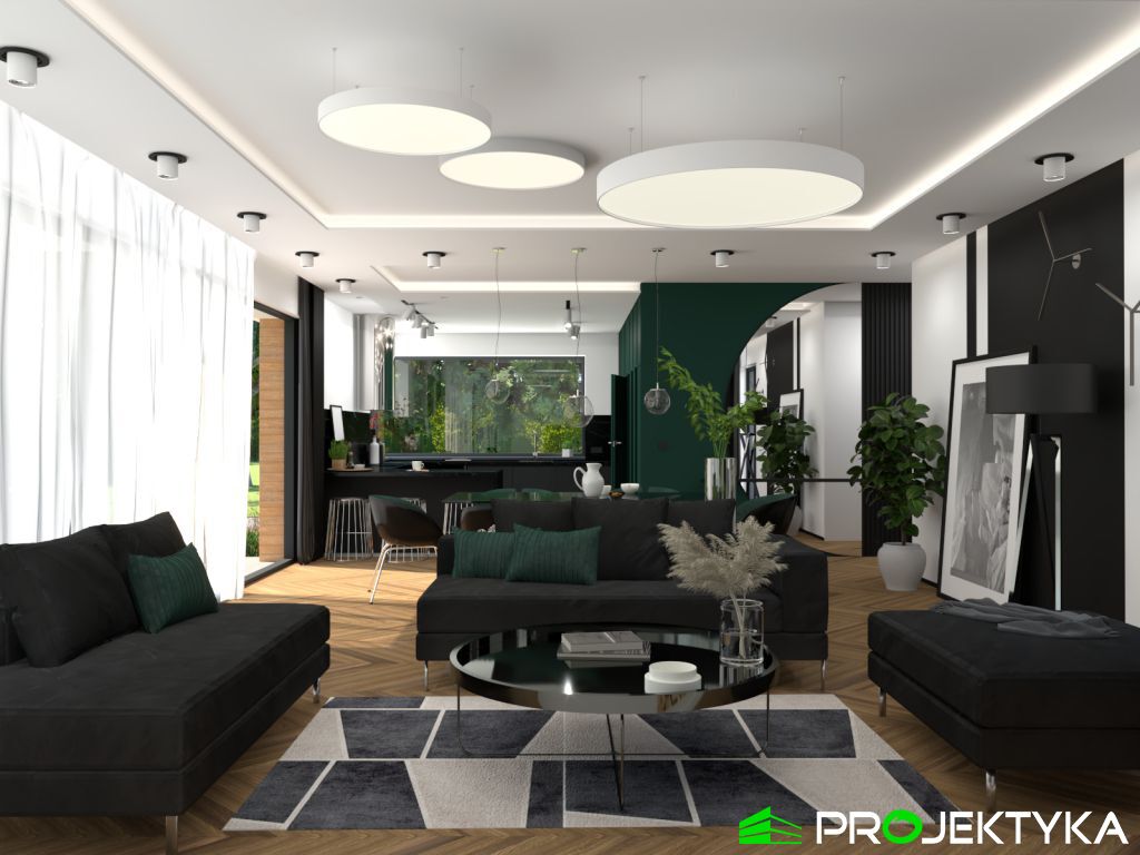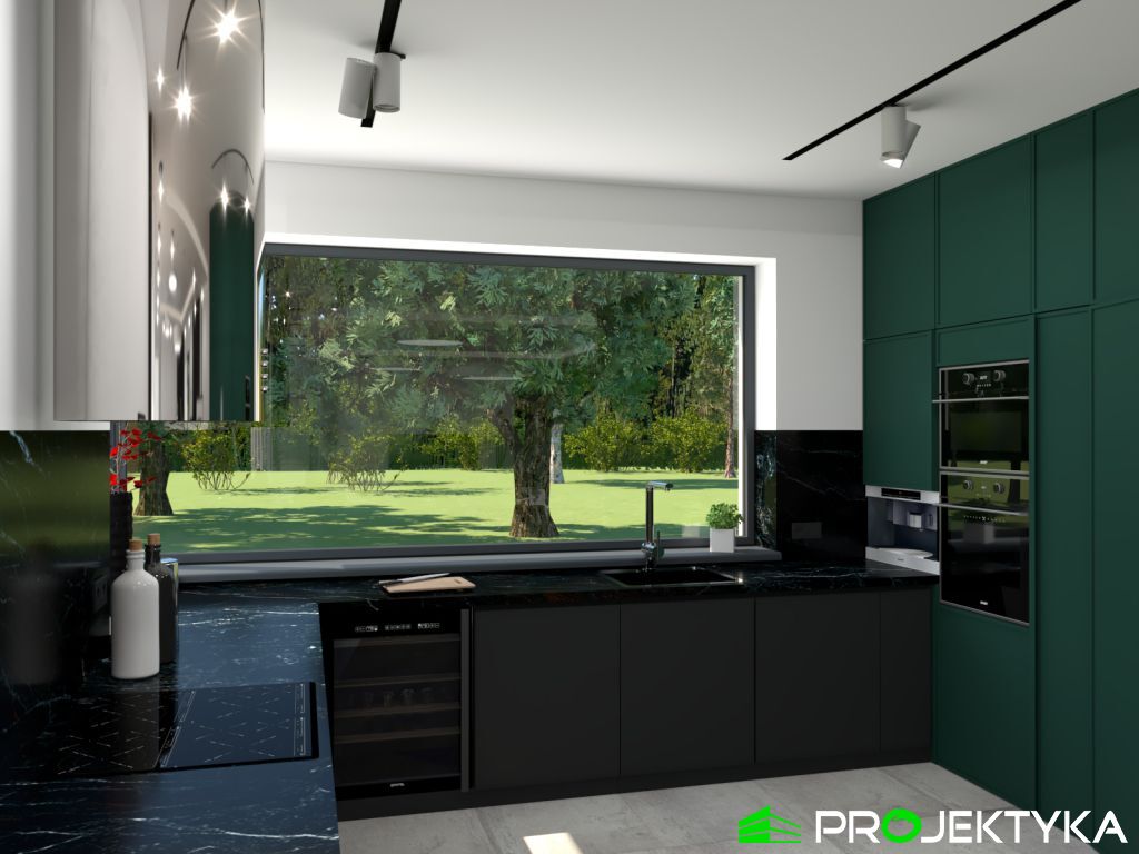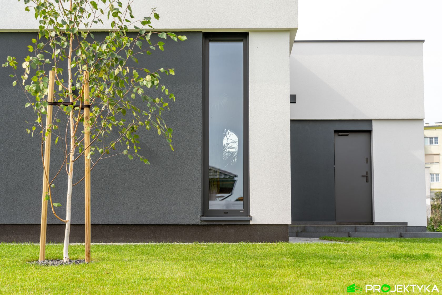 Ka150 M jest imponującym projektem domu parterowego w stylu nowoczesnym. Budynek przykryto dachem płaskim, natomiast wykonany został w technologii murowanej. Jego powierzchnia mieszkalna wynosi aż 229.29 m2, co sprawia, że będzie idealnym miejscem dla dużej rodziny. Dwustanowiskowy garaż łączy się z dwoma pomieszczeniami gospodarczymi. Dodatkowa można do niego wejść z korytarza wewnątrz domu. W lewej części domu znajduje się kuchnia z wydzieloną spiżarnia, jadalnia oraz przestronny salon połączony przeszkloną ścianą z dużym tarasem. Dodatkowy taras z tyłu domu, będzie idealnym miejscem na rozpoczęcia dnia, ponieważ mają do niego sypialnie. Ciąg komunikacyjny w kształcie litery L prowadzi do strefy nocnej składającej się z czterech sypialni, gabinetu, pralni, łazienki oraz WC. Dużym atutem tego projektu jest spora garderoba zlokalizowana przy wejściu, która dostępna jest z wiatrołapu. Wysokie okna sprawiają, że ten gotowy projekt domu parterowego gwarantuje dostęp do światła słonecznego przez cały dzień, o każdej porze roku!