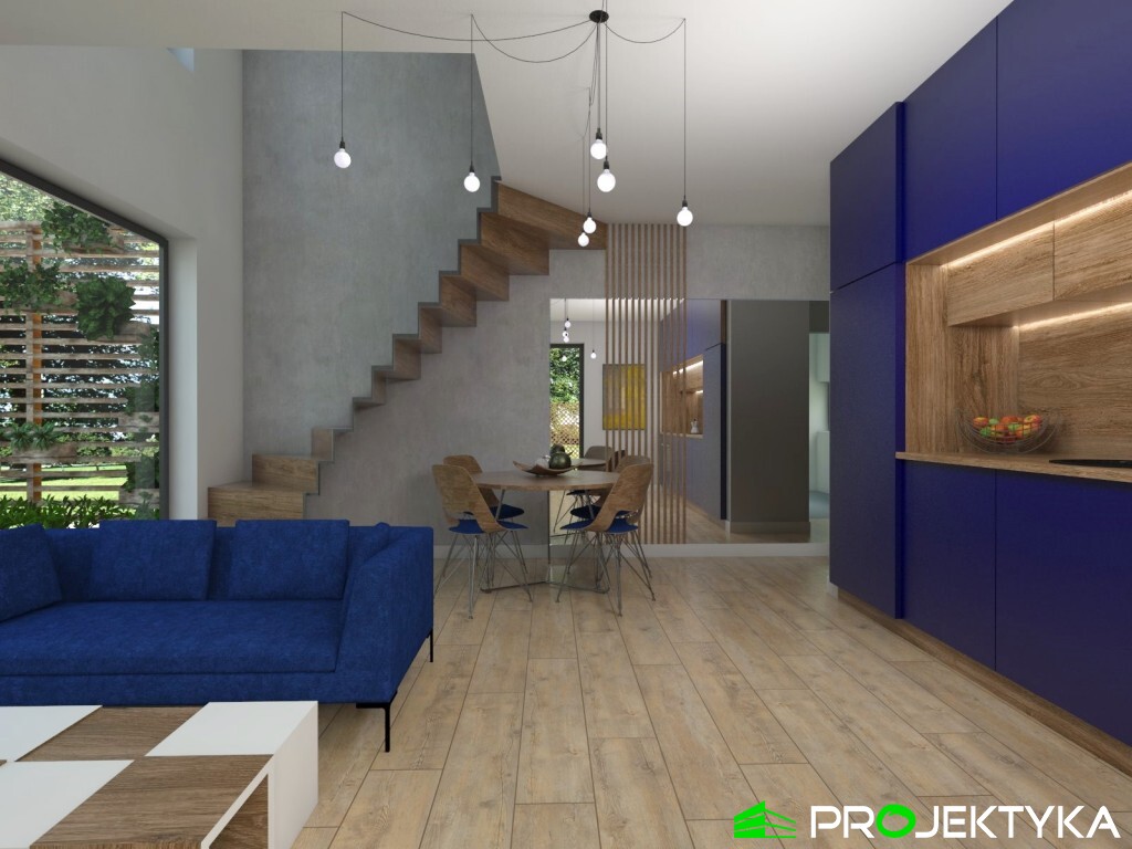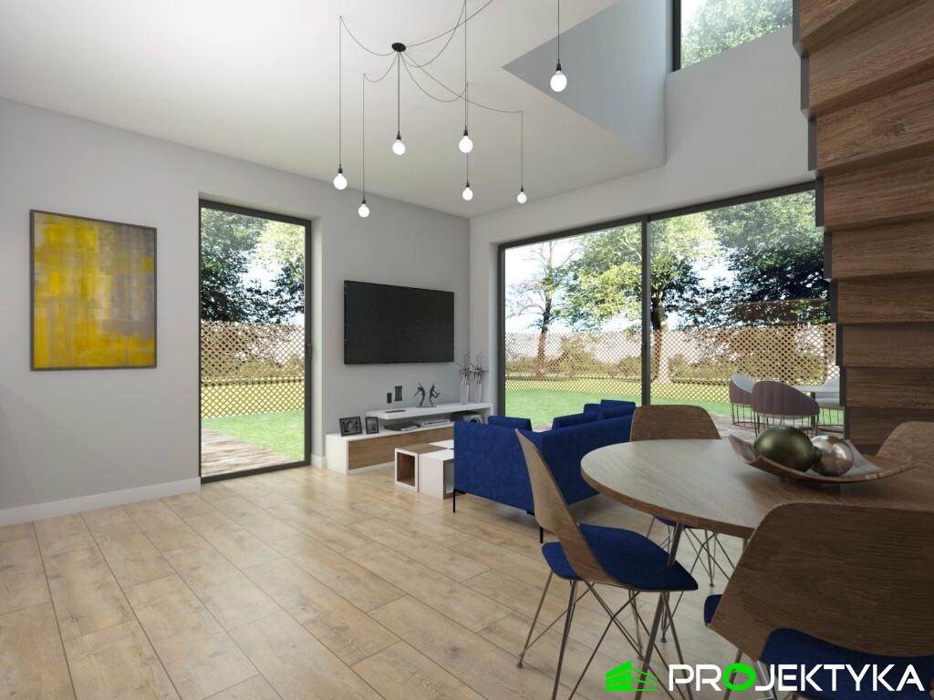 | Dodatkowe informacje | na wąską działkę, pustka nad salonem |