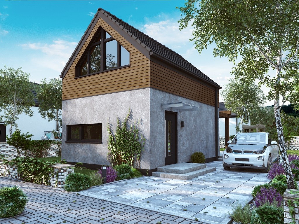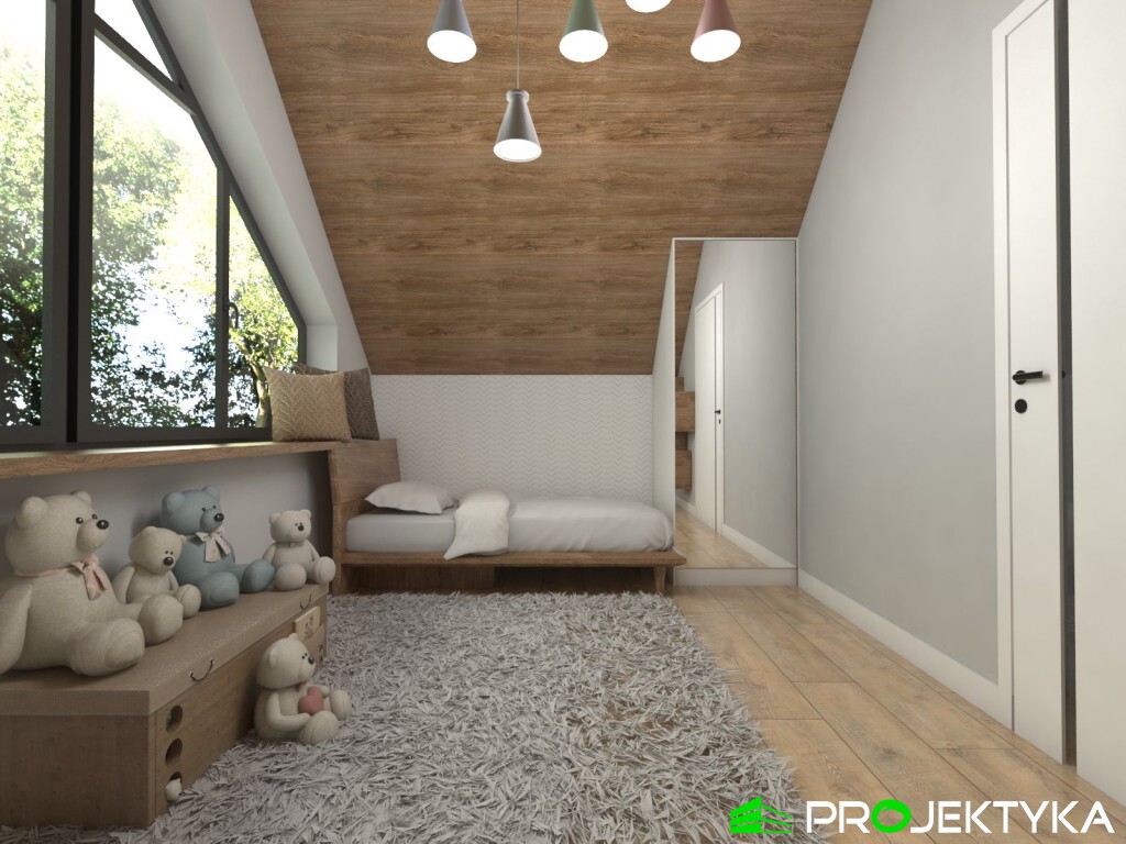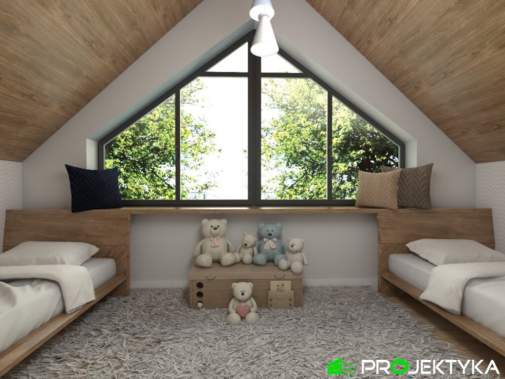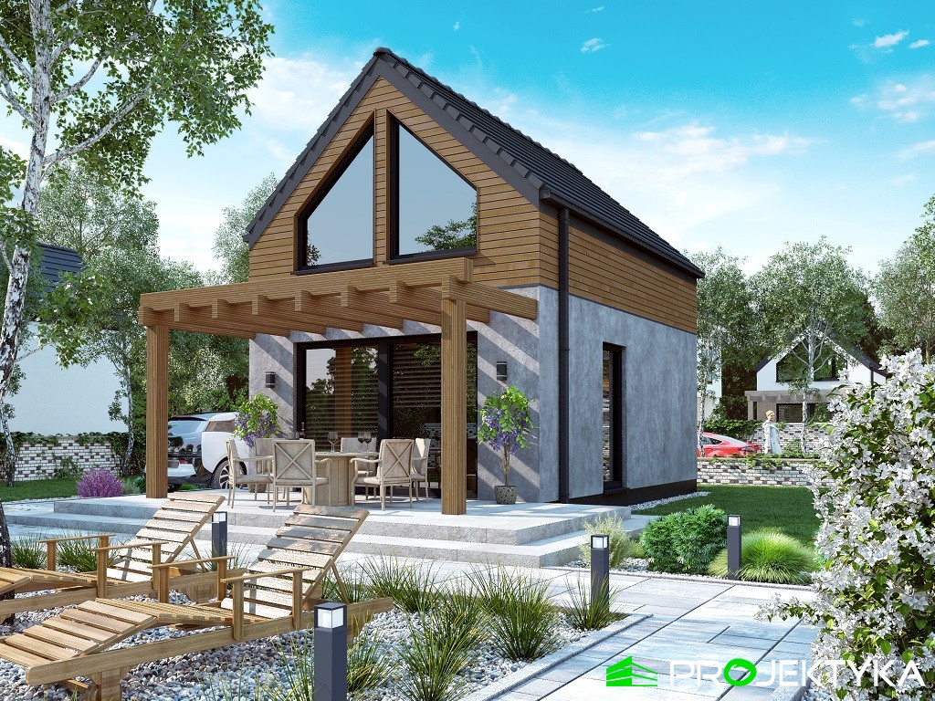 Tradycja w połączeniu z nowoczesnością – Ka158 T to wyjątkowy gotowy projekt domu jednorodzinnego w stylu nowoczesnej stodoły. Ka158 T to projekt domu letniskowego, parterowy z poddaszem użytkowym, ozdobiony nietypowymi oknami w kształcie trójkąta, w ścianach szczytowych. Ten projekt uwzględnia wszystko, czego potrzebuje inwestor do rodzinnego, letniego wypoczynku – w domu znajduje się salon z jadalnią i kuchnią oraz łazienką na parterze, zaś na poddaszu – dwie sypialnie. Powierzchnia użytkowa domu wynosi 41.31 m2 przy stosunkowo niewielkiej powierzchni zabudowy – 35 m2, co pozwala na realizację tego projektu domku letniskowego nawet na niewielkich działkach pod miastem, na zgłoszenie. W projekcie zwiększono przestrzeń użytkową, dzięki antresoli nad salonem, co daje wyjątkowy efekt.