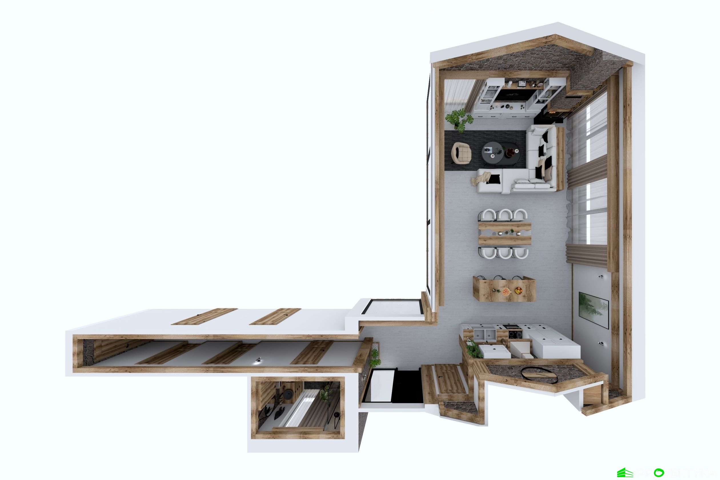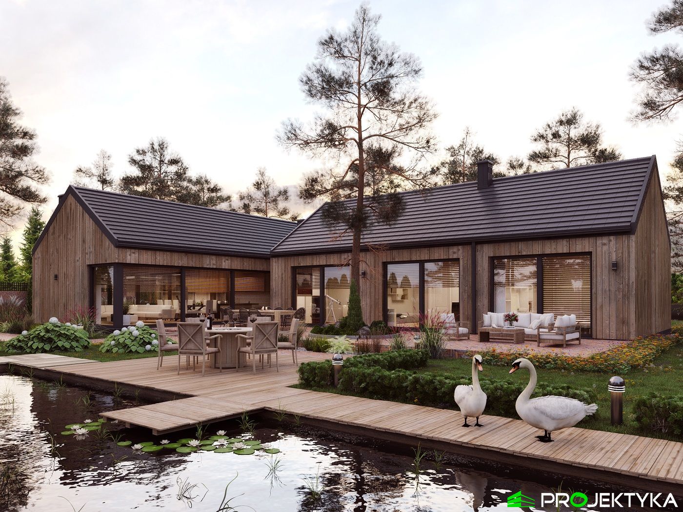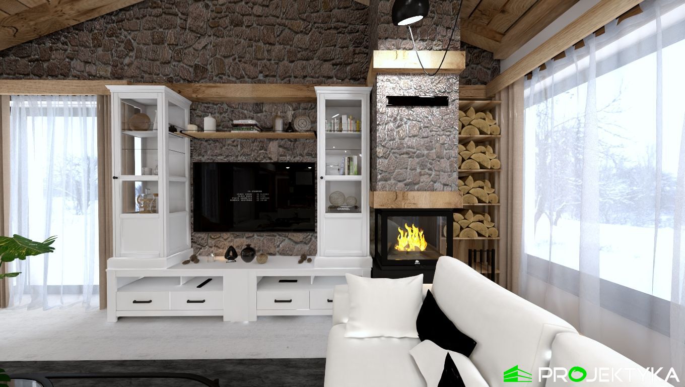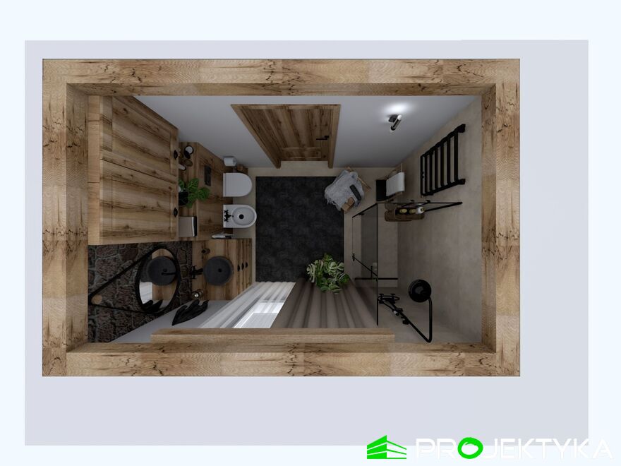 Ka165 Sz to nowoczesny projekt domu parterowego w technologii szkieletowej drewnianej. W rzucie ma on kształt litery L, czego efektem jest niezwykle funkcjonalny rozkład. Budynek kryty jest dwuspadowym dachem i posiada charakterystyczny wąski łącznik pomiędzy dwiema strefami. Znajduje się w nim wiatrołap osłonięty ścianami budynku z dwóch stron. Po prawej stronie od wejścia usytuowano przestronną strefę dzienną z otwartą kuchnią, jadalnią i wyjściem na taras, który znajduje się z tyłu i rozciąga się aż do końca strefy nocnej. Za kuchnią znalazło się również miejsce dla pomieszczenia gospodarczego, spiżarni oraz garderoby. Ten wyjątkowy projekt domu z trzema sypialniami posiada aż dwie łazienki – jedna z nich przynależy do sypialni, zaś druga znajduje się w sąsiedztwie wiatrołapu. W budynku uwzględniono także pralnię, umieszczoną obok garderoby wspólnej dla wszystkich domowników. Ten wyjątkowy projekt domu w stylu nowoczesnym ma aż 152.48 m2 powierzchni mieszkalnej – jest zatem idealny do realizacji na potrzeby trzy- lub czteroosobowej rodziny. Wysokie okna wspaniale doświetlą wnętrze i optycznie podwyższają budynek. Jako ogrzewanie zaplanowano w nim pompę ciepła, a dodatkowo mieszkańcy będą mieć do dyspozycji strych na poddaszu.