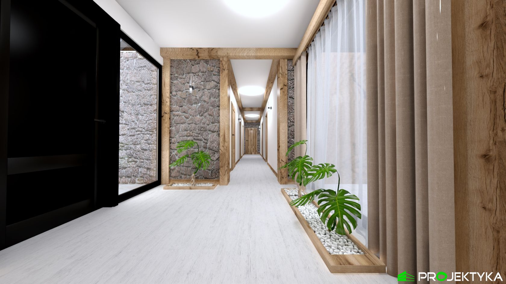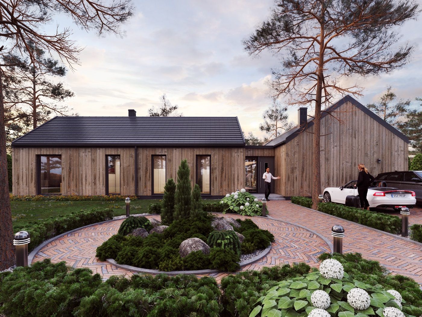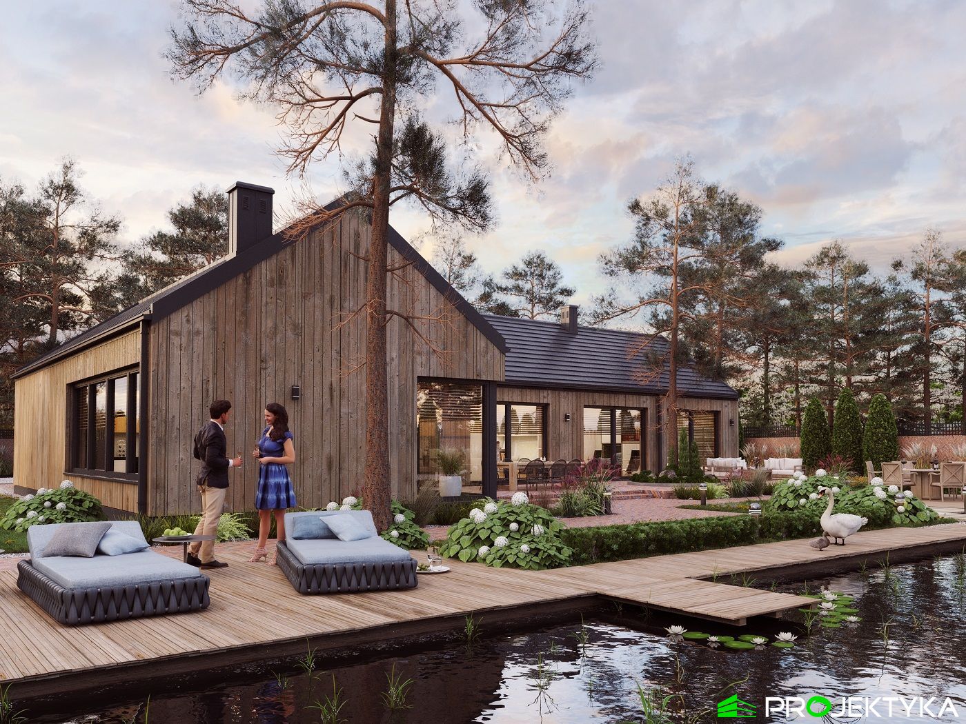 Ka165 Sz to nowoczesny projekt domu parterowego w technologii szkieletowej drewnianej. W rzucie ma on kształt litery L, czego efektem jest niezwykle funkcjonalny rozkład. Budynek kryty jest dwuspadowym dachem i posiada charakterystyczny wąski łącznik pomiędzy dwiema strefami. Znajduje się w nim wiatrołap osłonięty ścianami budynku z dwóch stron. Po prawej stronie od wejścia usytuowano przestronną strefę dzienną z otwartą kuchnią, jadalnią i wyjściem na taras, który znajduje się z tyłu i rozciąga się aż do końca strefy nocnej. Za kuchnią znalazło się również miejsce dla pomieszczenia gospodarczego, spiżarni oraz garderoby. Ten wyjątkowy projekt domu z trzema sypialniami posiada aż dwie łazienki – jedna z nich przynależy do sypialni, zaś druga znajduje się w sąsiedztwie wiatrołapu. W budynku uwzględniono także pralnię, umieszczoną obok garderoby wspólnej dla wszystkich domowników. Ten wyjątkowy projekt domu w stylu nowoczesnym ma aż 152.48 m2 powierzchni mieszkalnej – jest zatem idealny do realizacji na potrzeby trzy- lub czteroosobowej rodziny. Wysokie okna wspaniale doświetlą wnętrze i optycznie podwyższają budynek. Jako ogrzewanie zaplanowano w nim pompę ciepła, a dodatkowo mieszkańcy będą mieć do dyspozycji strych na poddaszu.
