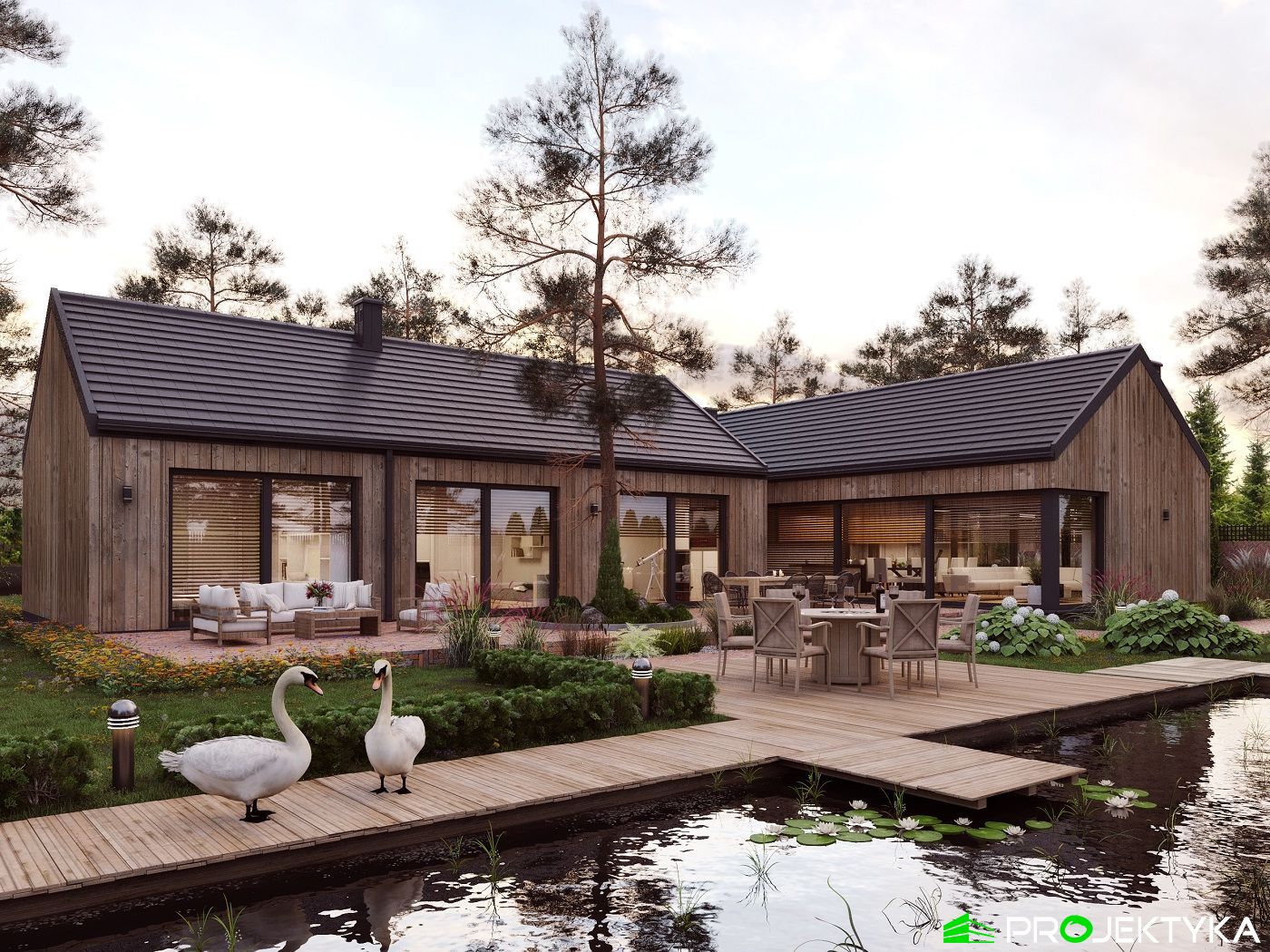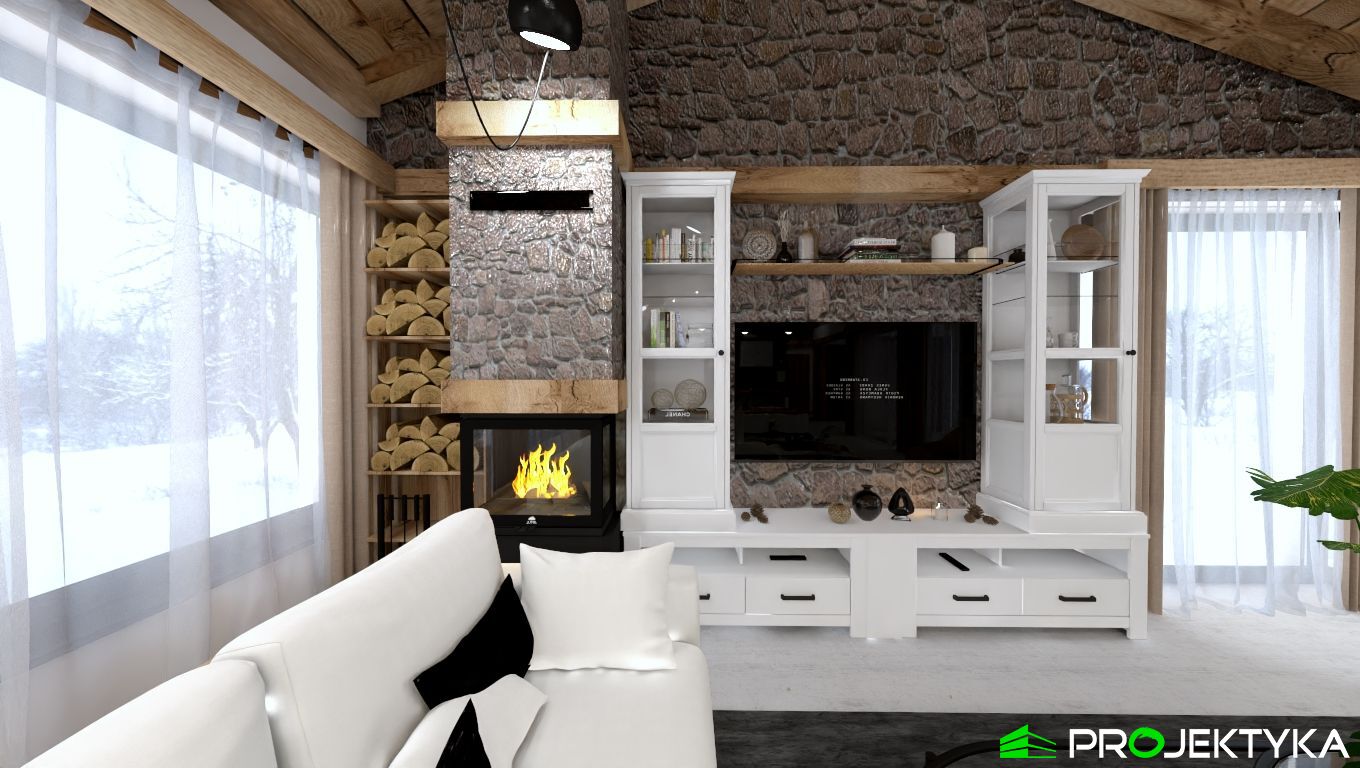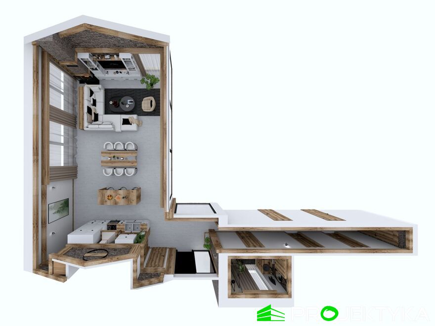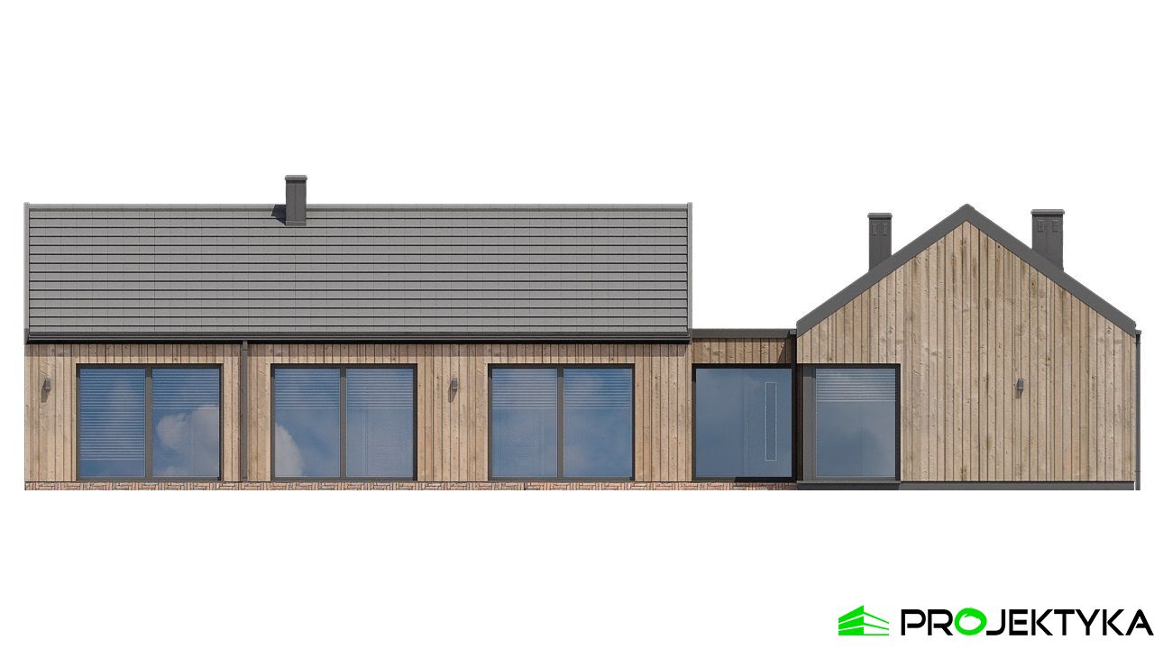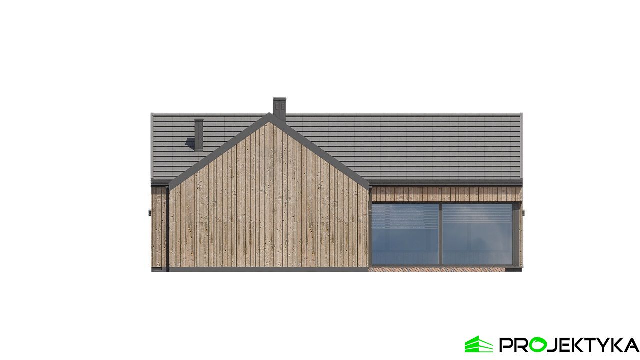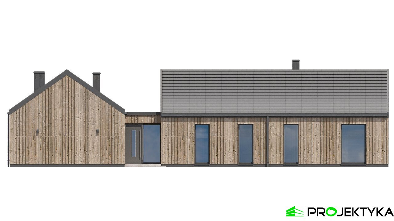 Ka165 Sz to nowoczesny projekt domu parterowego w technologii szkieletowej drewnianej. W rzucie ma on kształt litery L, czego efektem jest niezwykle funkcjonalny rozkład. Budynek kryty jest dwuspadowym dachem i posiada charakterystyczny wąski łącznik pomiędzy dwiema strefami. Znajduje się w nim wiatrołap osłonięty ścianami budynku z dwóch stron. Po prawej stronie od wejścia usytuowano przestronną strefę dzienną z otwartą kuchnią, jadalnią i wyjściem na taras, który znajduje się z tyłu i rozciąga się aż do końca strefy nocnej. Za kuchnią znalazło się również miejsce dla pomieszczenia gospodarczego, spiżarni oraz garderoby. Ten wyjątkowy projekt domu z trzema sypialniami posiada aż dwie łazienki – jedna z nich przynależy do sypialni, zaś druga znajduje się w sąsiedztwie wiatrołapu. W budynku uwzględniono także pralnię, umieszczoną obok garderoby wspólnej dla wszystkich domowników. Ten wyjątkowy projekt domu w stylu nowoczesnym ma aż 152.48 m2 powierzchni mieszkalnej – jest zatem idealny do realizacji na potrzeby trzy- lub czteroosobowej rodziny. Wysokie okna wspaniale doświetlą wnętrze i optycznie podwyższają budynek. Jako ogrzewanie zaplanowano w nim pompę ciepła, a dodatkowo mieszkańcy będą mieć do dyspozycji strych na poddaszu.