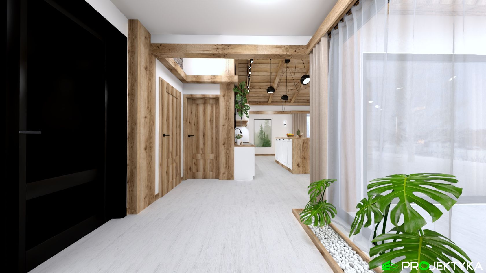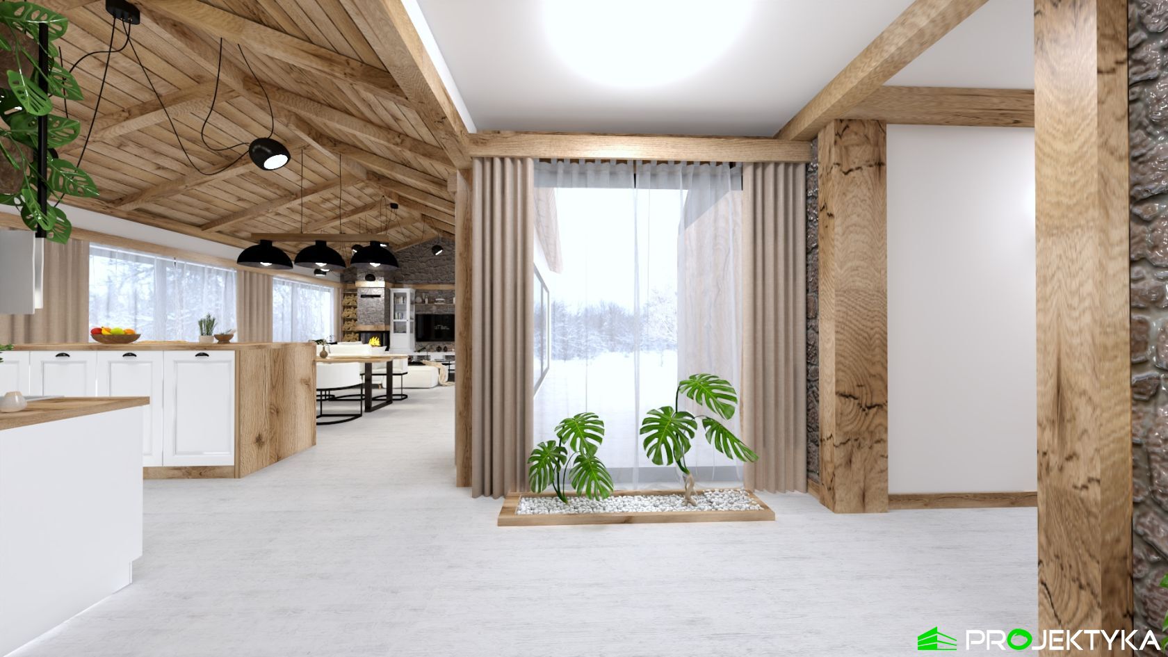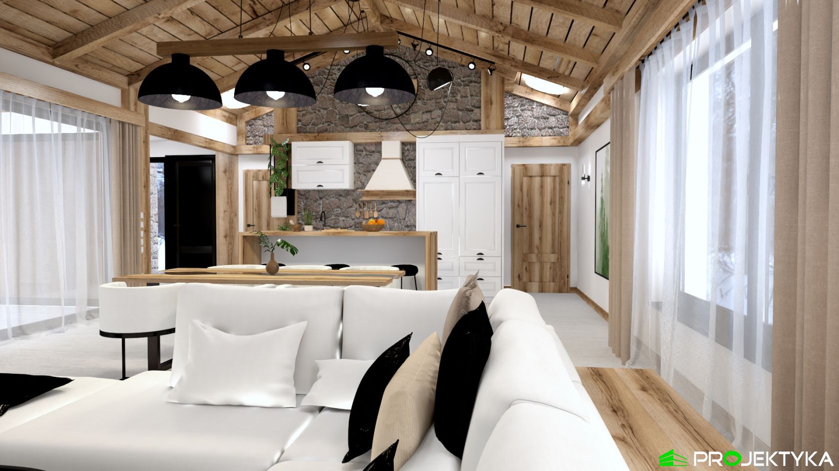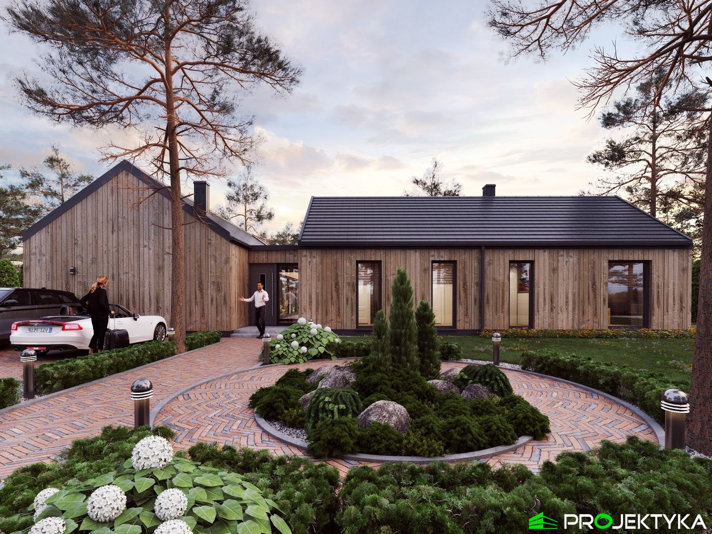 Ka165 Sz to nowoczesny projekt domu parterowego w technologii szkieletowej drewnianej. W rzucie ma on kształt litery L, czego efektem jest niezwykle funkcjonalny rozkład. Budynek kryty jest dwuspadowym dachem i posiada charakterystyczny wąski łącznik pomiędzy dwiema strefami. Znajduje się w nim wiatrołap osłonięty ścianami budynku z dwóch stron. Po prawej stronie od wejścia usytuowano przestronną strefę dzienną z otwartą kuchnią, jadalnią i wyjściem na taras, który znajduje się z tyłu i rozciąga się aż do końca strefy nocnej. Za kuchnią znalazło się również miejsce dla pomieszczenia gospodarczego, spiżarni oraz garderoby. Ten wyjątkowy projekt domu z trzema sypialniami posiada aż dwie łazienki – jedna z nich przynależy do sypialni, zaś druga znajduje się w sąsiedztwie wiatrołapu. W budynku uwzględniono także pralnię, umieszczoną obok garderoby wspólnej dla wszystkich domowników. Ten wyjątkowy projekt domu w stylu nowoczesnym ma aż 152.48 m2 powierzchni mieszkalnej – jest zatem idealny do realizacji na potrzeby trzy- lub czteroosobowej rodziny. Wysokie okna wspaniale doświetlą wnętrze i optycznie podwyższają budynek. Jako ogrzewanie zaplanowano w nim pompę ciepła, a dodatkowo mieszkańcy będą mieć do dyspozycji strych na poddaszu.