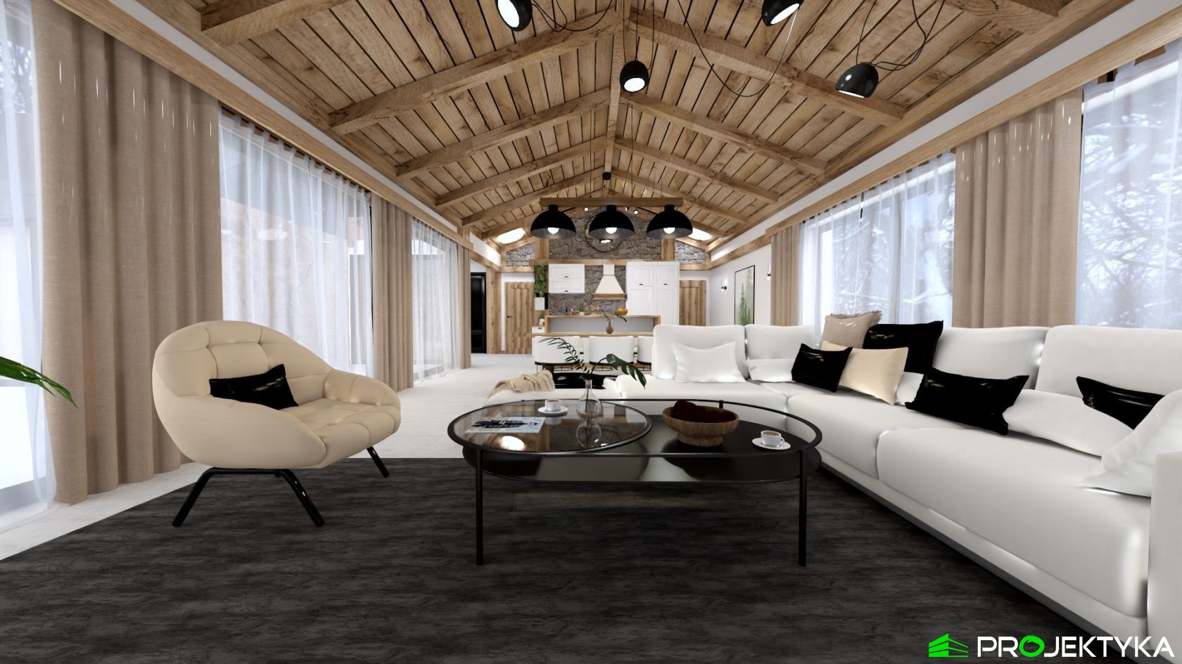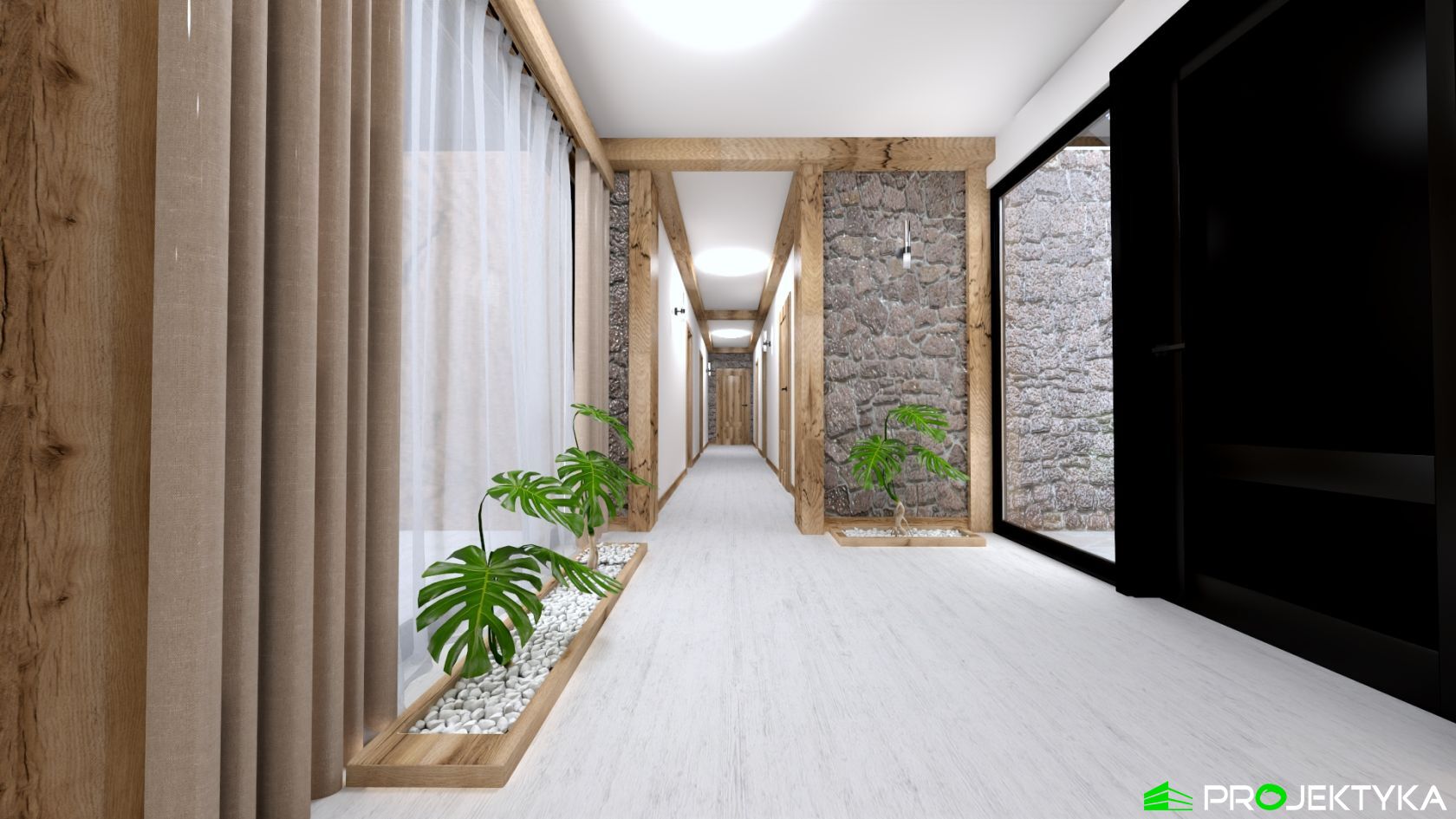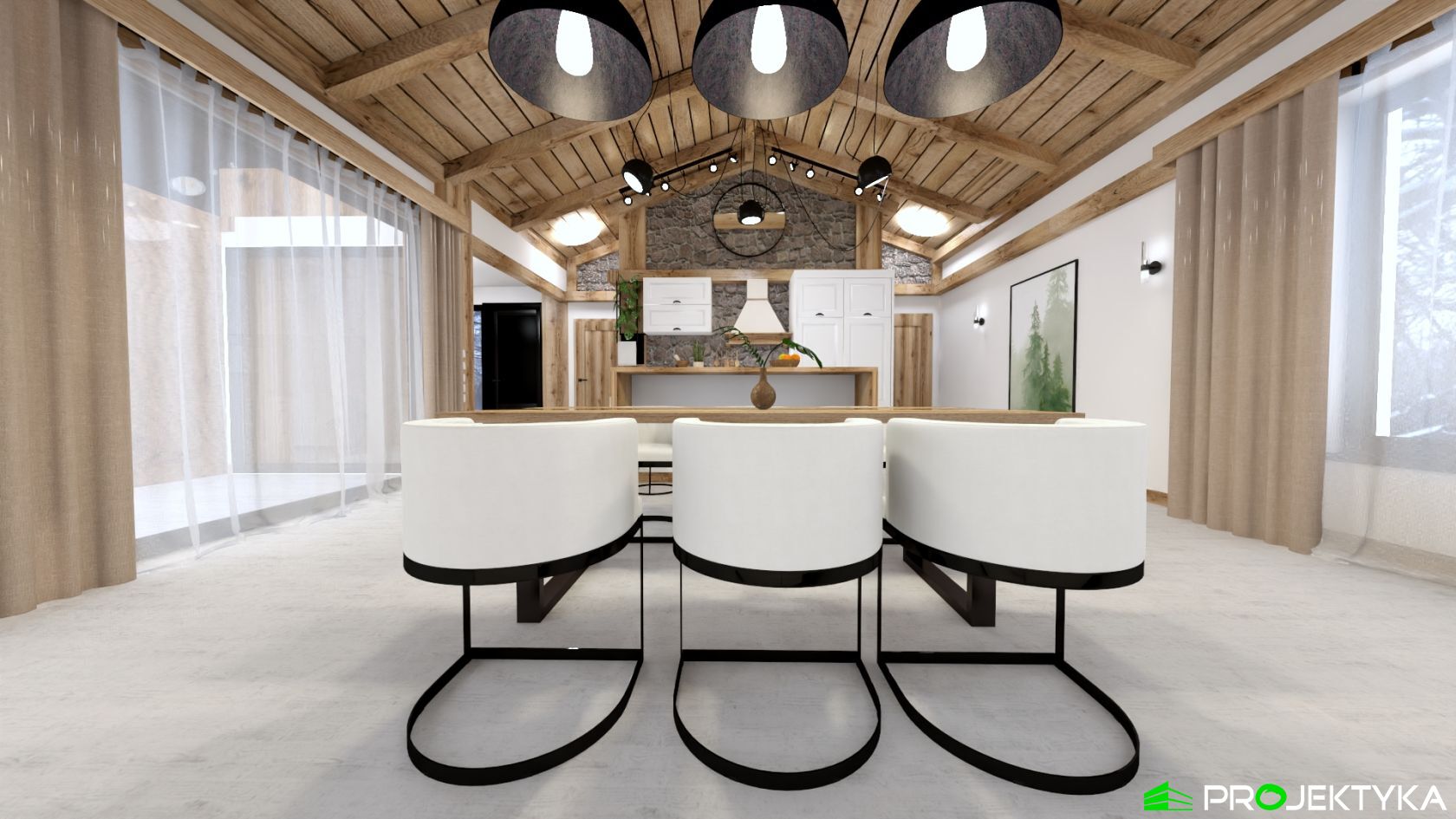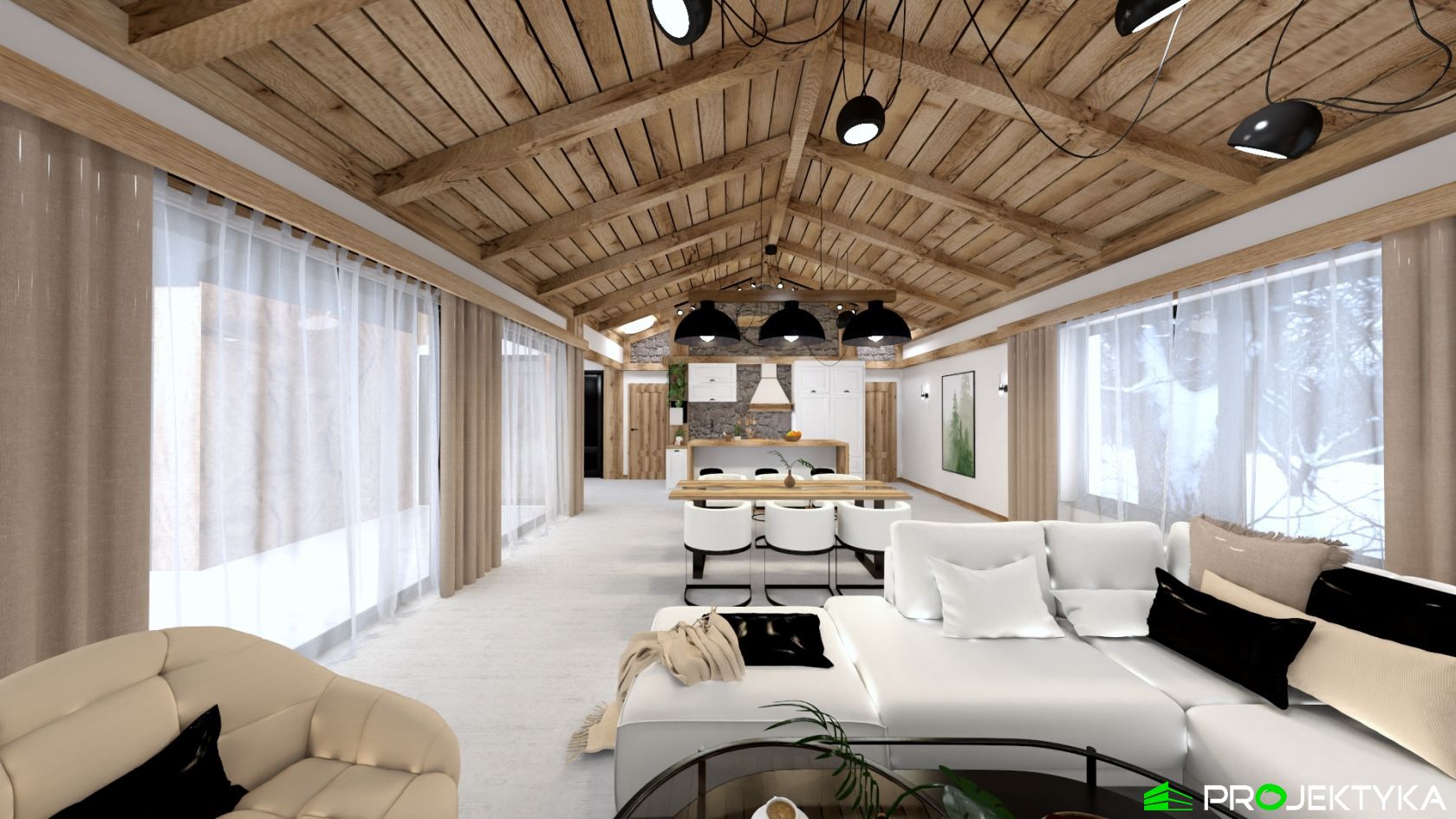 Ka165 Sz to nowoczesny projekt domu parterowego w technologii szkieletowej drewnianej. W rzucie ma on kształt litery L, czego efektem jest niezwykle funkcjonalny rozkład. Budynek kryty jest dwuspadowym dachem i posiada charakterystyczny wąski łącznik pomiędzy dwiema strefami. Znajduje się w nim wiatrołap osłonięty ścianami budynku z dwóch stron. Po prawej stronie od wejścia usytuowano przestronną strefę dzienną z otwartą kuchnią, jadalnią i wyjściem na taras, który znajduje się z tyłu i rozciąga się aż do końca strefy nocnej. Za kuchnią znalazło się również miejsce dla pomieszczenia gospodarczego, spiżarni oraz garderoby. Ten wyjątkowy projekt domu z trzema sypialniami posiada aż dwie łazienki – jedna z nich przynależy do sypialni, zaś druga znajduje się w sąsiedztwie wiatrołapu. W budynku uwzględniono także pralnię, umieszczoną obok garderoby wspólnej dla wszystkich domowników. Ten wyjątkowy projekt domu w stylu nowoczesnym ma aż 152.48 m2 powierzchni mieszkalnej – jest zatem idealny do realizacji na potrzeby trzy- lub czteroosobowej rodziny. Wysokie okna wspaniale doświetlą wnętrze i optycznie podwyższają budynek. Jako ogrzewanie zaplanowano w nim pompę ciepła, a dodatkowo mieszkańcy będą mieć do dyspozycji strych na poddaszu.