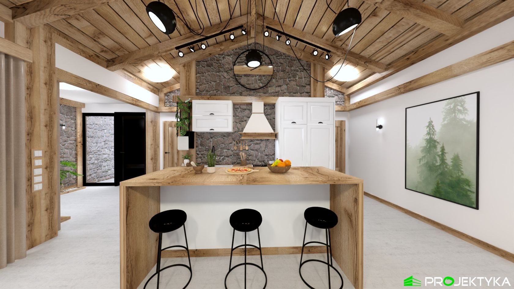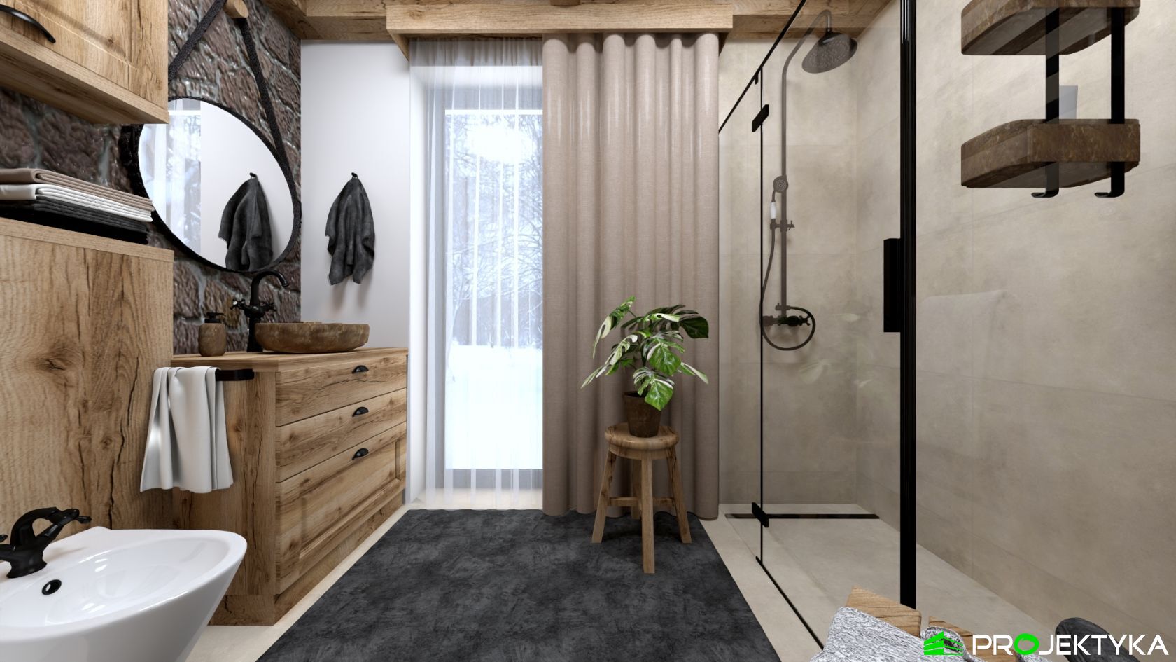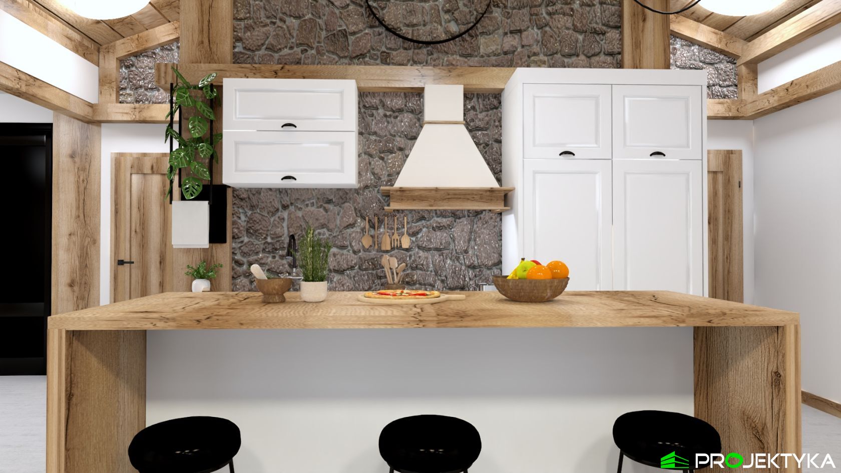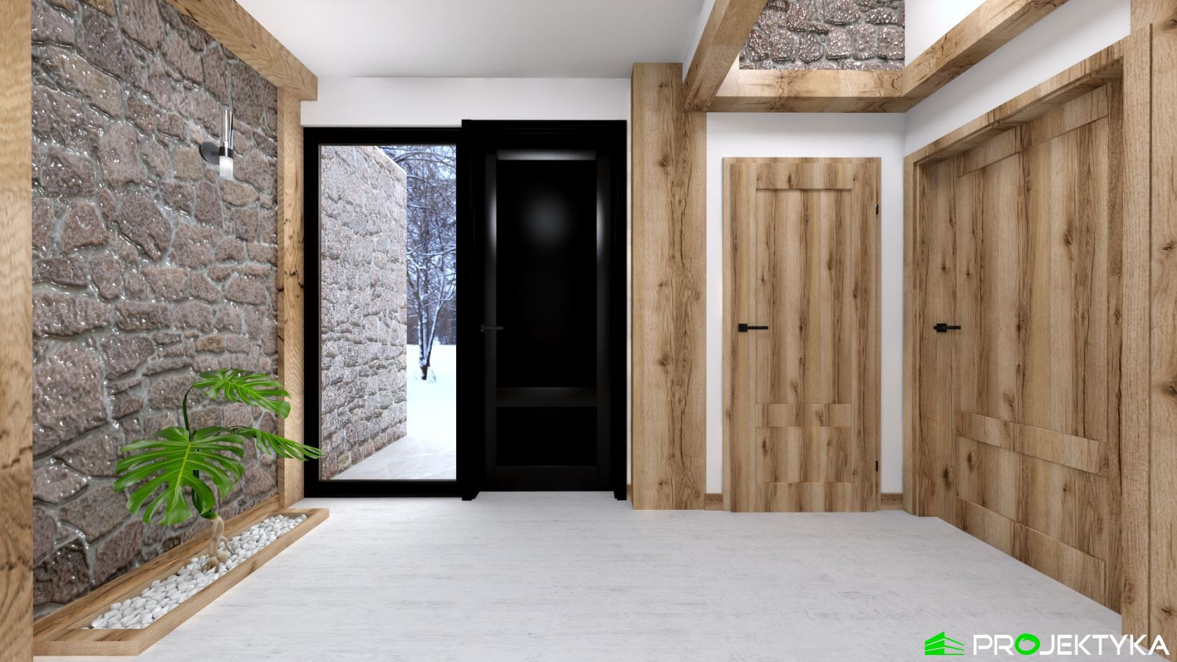 Ka165 Sz to nowoczesny projekt domu parterowego w technologii szkieletowej drewnianej. W rzucie ma on kształt litery L, czego efektem jest niezwykle funkcjonalny rozkład. Budynek kryty jest dwuspadowym dachem i posiada charakterystyczny wąski łącznik pomiędzy dwiema strefami. Znajduje się w nim wiatrołap osłonięty ścianami budynku z dwóch stron. Po prawej stronie od wejścia usytuowano przestronną strefę dzienną z otwartą kuchnią, jadalnią i wyjściem na taras, który znajduje się z tyłu i rozciąga się aż do końca strefy nocnej. Za kuchnią znalazło się również miejsce dla pomieszczenia gospodarczego, spiżarni oraz garderoby. Ten wyjątkowy projekt domu z trzema sypialniami posiada aż dwie łazienki – jedna z nich przynależy do sypialni, zaś druga znajduje się w sąsiedztwie wiatrołapu. W budynku uwzględniono także pralnię, umieszczoną obok garderoby wspólnej dla wszystkich domowników. Ten wyjątkowy projekt domu w stylu nowoczesnym ma aż 152.48 m2 powierzchni mieszkalnej – jest zatem idealny do realizacji na potrzeby trzy- lub czteroosobowej rodziny. Wysokie okna wspaniale doświetlą wnętrze i optycznie podwyższają budynek. Jako ogrzewanie zaplanowano w nim pompę ciepła, a dodatkowo mieszkańcy będą mieć do dyspozycji strych na poddaszu.