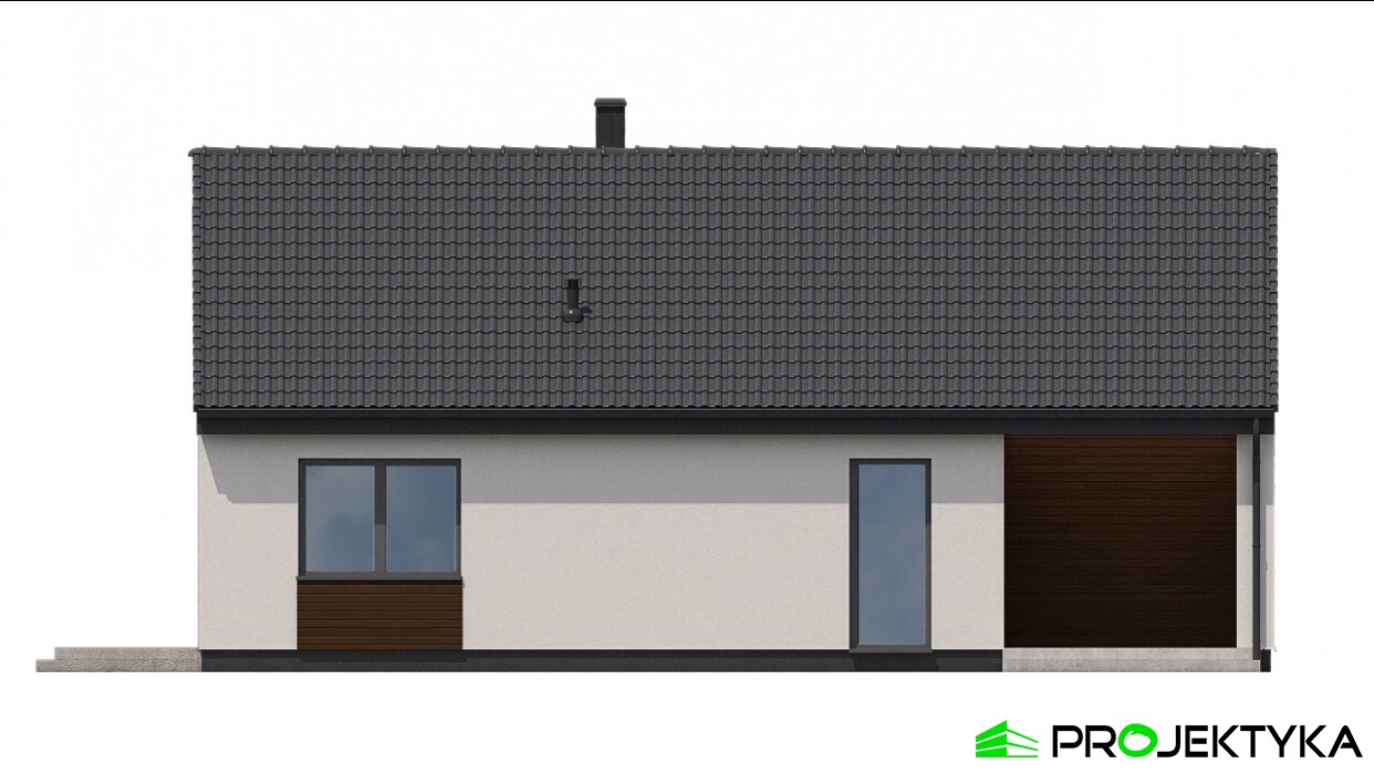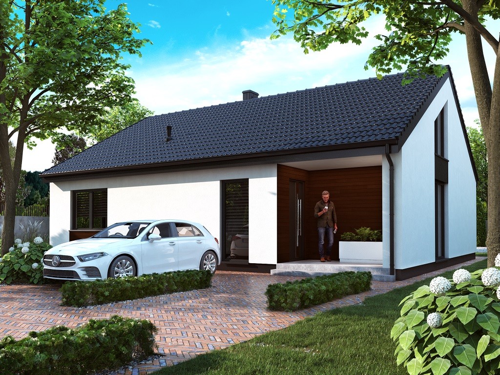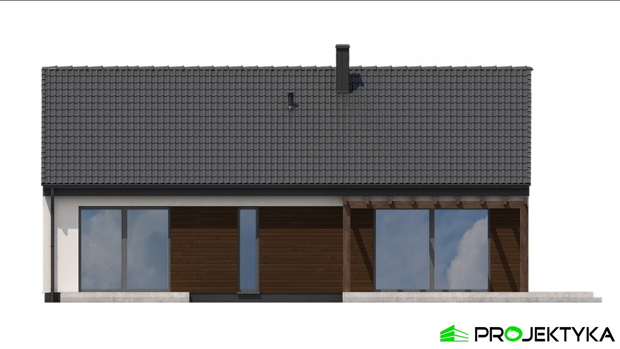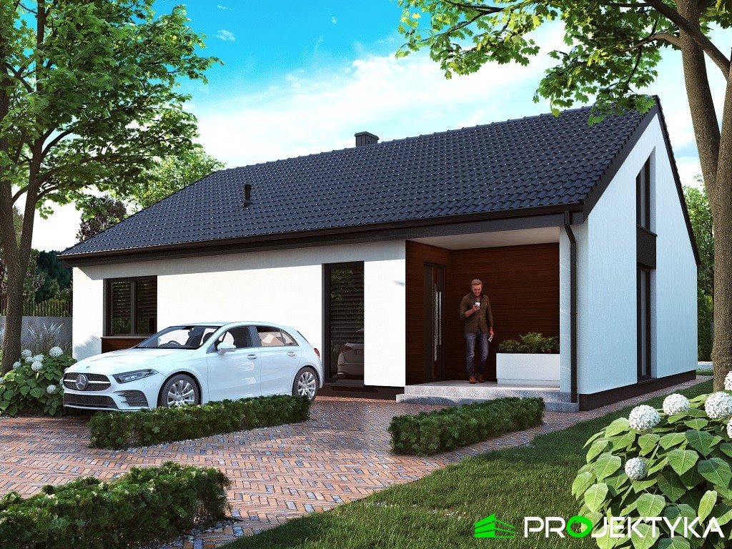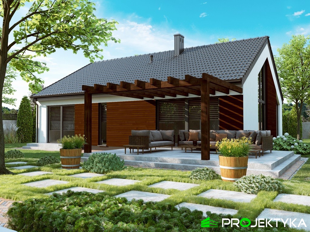 Ka209 to projekt domu w technologii murowanej o powierzchni mieszkalnej wynoszącej 101.79 m2 – doskonałej dla 3-osobowej rodziny. Dwuspadowy dach przykrywający budynek o kształcie prostokąta daje ciekawy efekt minimalizmu. Jest to projekt domu parterowego bez garażu, dzięki czemu doskonale wpasuje się na wąską działkę. Cechą charakterystyczną tego budynku są wysokie okna dopasowane do kształtu ściany szczytowej na bocznych elewacjach. Jest to rezultat utworzenia pustki nad salonem, dzięki czemu strefa dzienna jest niezwykle przestrzenna i doskonale doświetlona. W projekcie uwzględniono wygodny taras na tyłach domu, skryty pod zadaszeniem w formie pergoli, tworzący klimatyczne miejsce do wypoczynku w ciepłych miesiącach. Dom podzielono na strefę dzienną z otwartą kuchnią, jadalnią i salonem po lewej stronie oraz strefę nocną z dwiema sypialniami po prawej. W centralnej części znajduje się ciąg komunikacyjny z korytarzem, spiżarnią, łazienką, osobnym WC oraz kotłownią. Dzięki takiemu rozlokowaniu pomieszczeń wnętrze staje się niezwykle funkcjonalne, a strefy komfortowo od siebie oddzielone.
