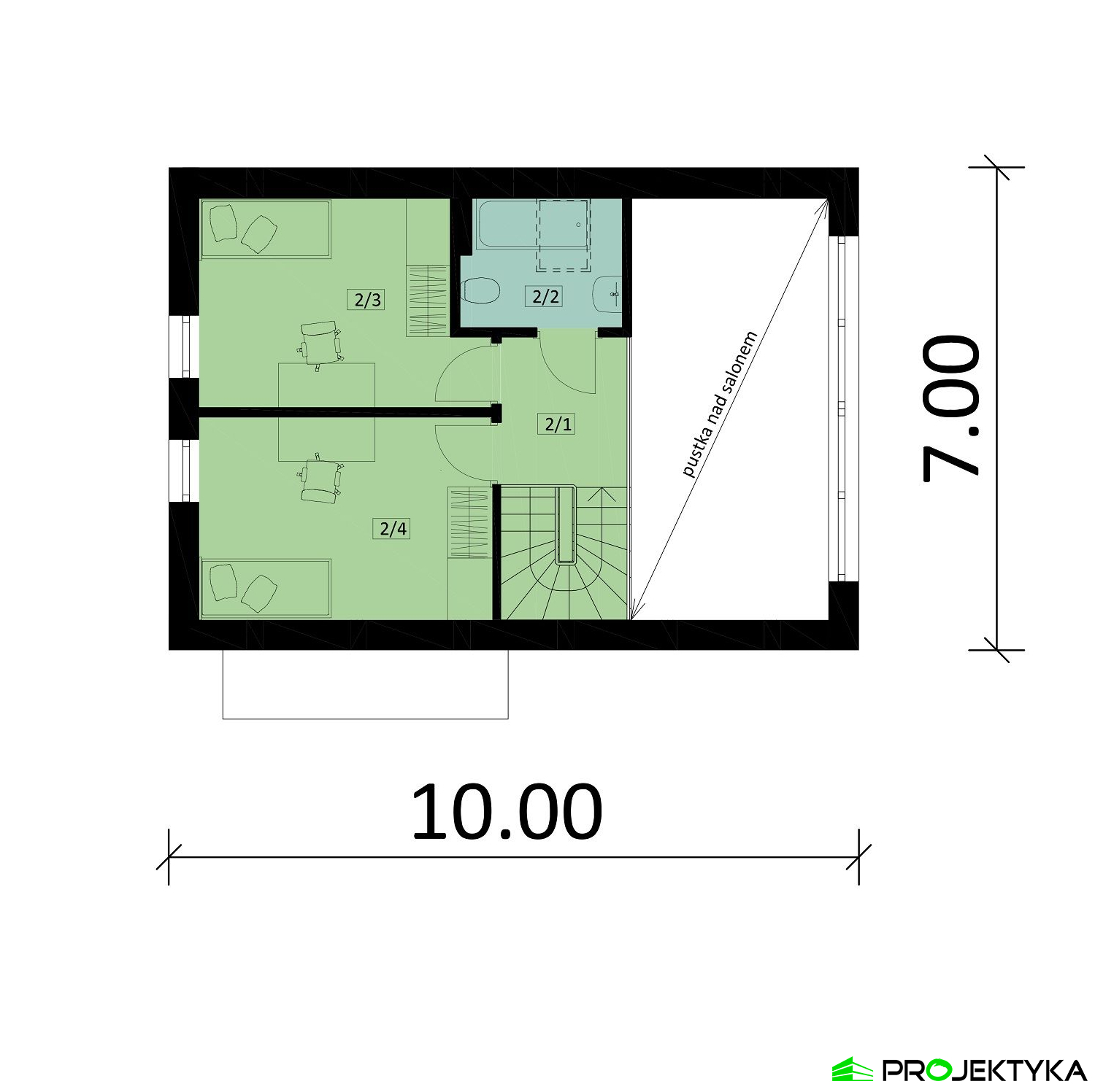 Ka254 T to projekt domu w stylu nowoczesnej stodoły o unikalnej architekturze. Prosta bryła z poddaszem o wysokiej ścianie kolankowej zwieńczona została dwuspadowym dachem bez okapu. Rezultat to bardzo stylowy parter z wydzieloną strefą dzienną oraz strefa sypialniana na górze, skryta pod wygodnym do urządzenia skosem. Ten projekt domu z pustką nad salonem z pewnością przypadnie do gustu rodzinie 2+2 poszukującej czegoś o minimalistycznej, ale efektownej bryle. Dom jest prosty do wykonania głównie z uwagi na nieskomplikowaną konstrukcję dachu z jednym oknem połaciowym – pozostałe występują jedynie w ścianie szczytowej poddasza układając się w jej kształt, jednocześnie naturalnie doświetlając strefę dzienną oraz górną kondygnację z lewej strony. Wysokie okna zaprojektowano również w dwóch sypialniach na poddaszu. Jedno małe okno połaciowe doświetla łazienkę na poddaszu. Projekt domu z poddaszem użytkowym Ka254 T ma powierzchnię mieszkalną wynoszącą 78.13 m2, o praktycznie zagospodarowanym wnętrzu – na parterze posiada salon z otwartą kuchnią i jadalnią z wyjściem na taras oraz dużą sypialnię z garderobą, a także przylegającą do niej małą łazienkę w korytarzu pomiędzy sypialnią a salonem. W domu uwzględniono również pomieszczenie gospodarcze po prawej stronie wiatrołapu, a także dwie wygodne sypialnie i łazienkę na poddaszu.