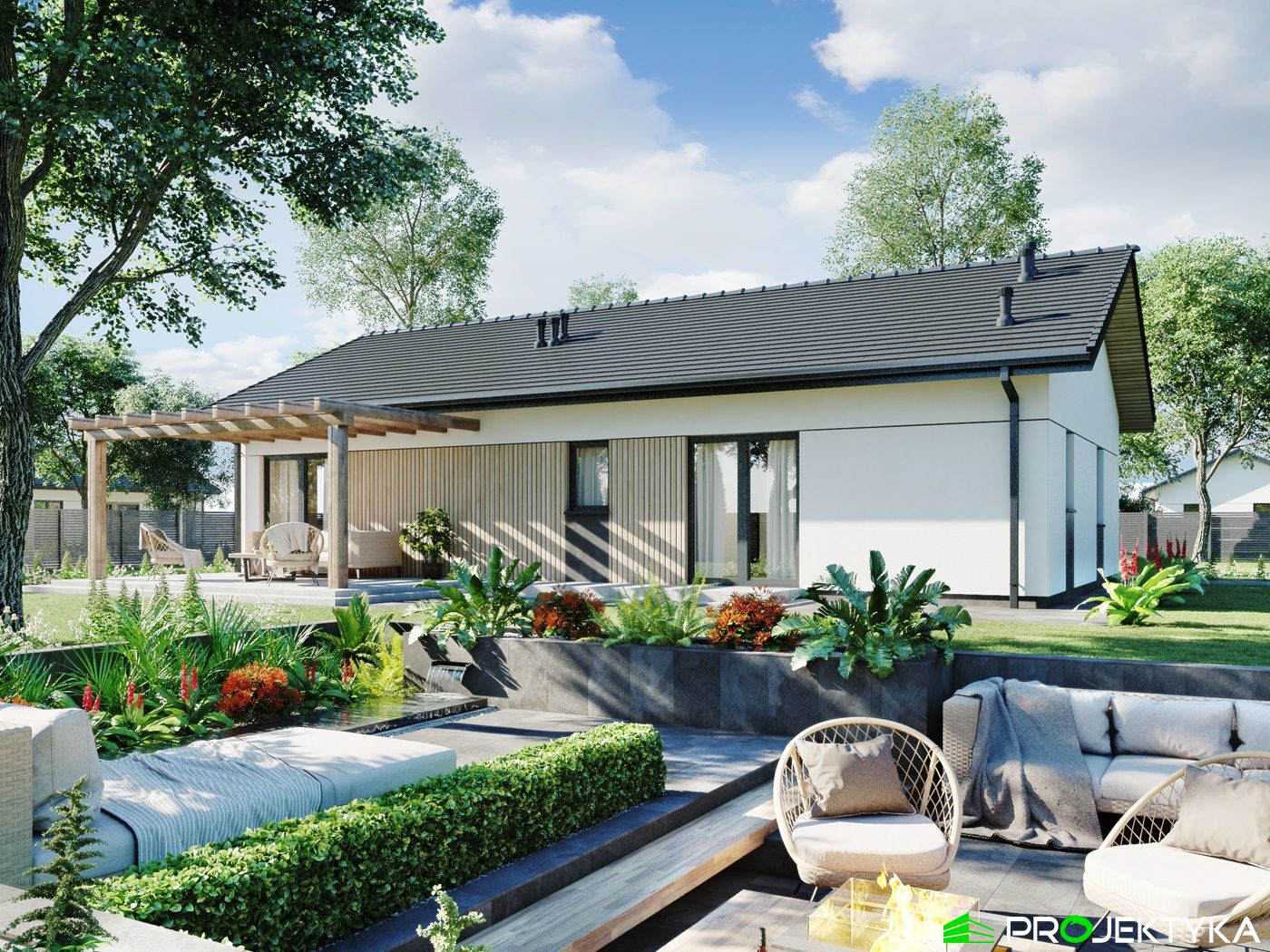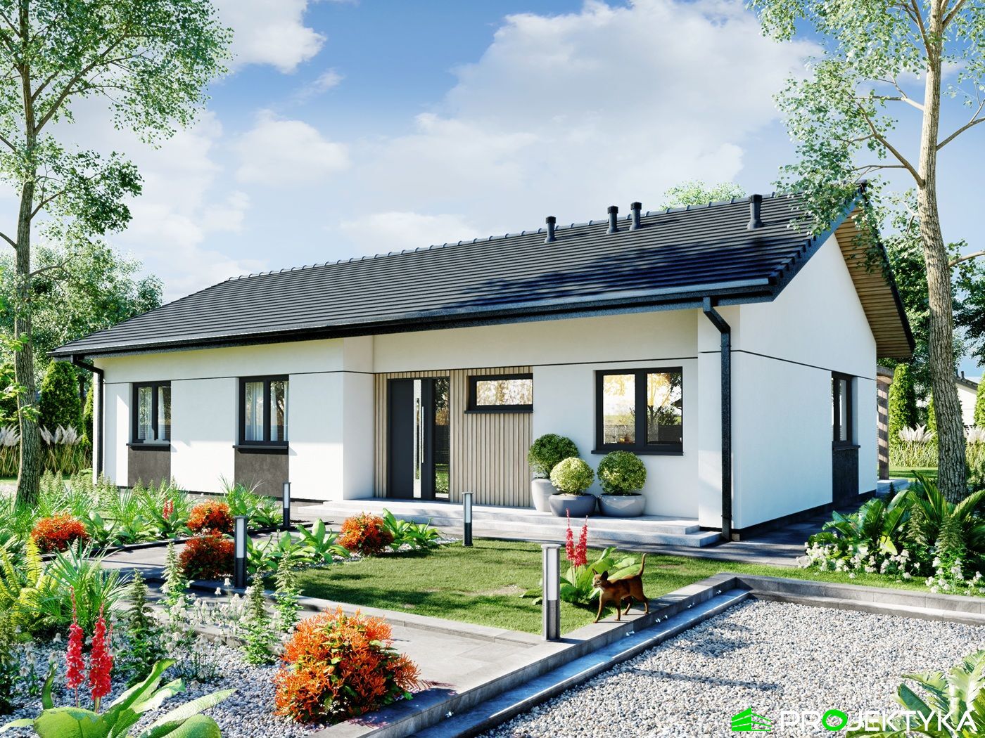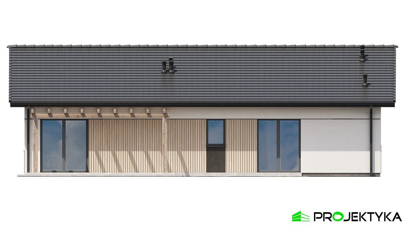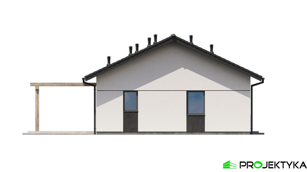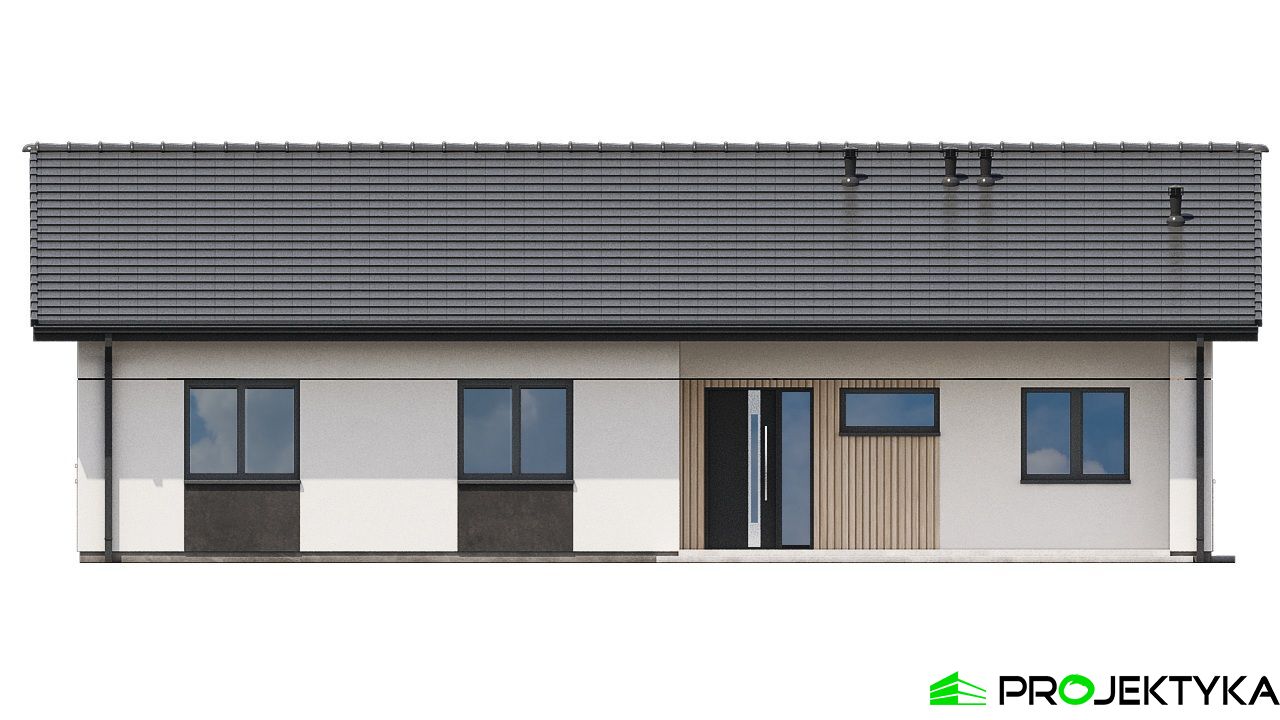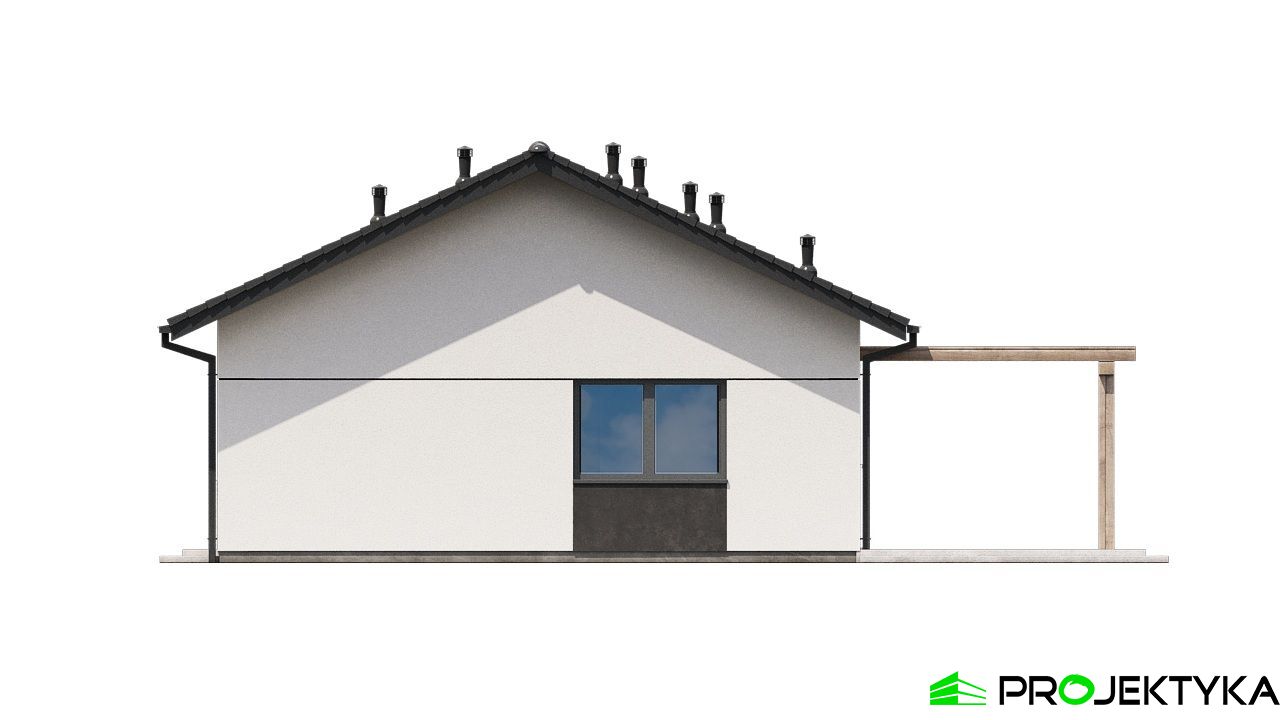 Projekt Ka279 to funkcjonalny dom parterowy o powierzchni mieszkalnej 86,68 m², zaprojektowany z myślą o rodzinie 2–4-osobowej. Część dzienna to przestronny salon z jadalnią, kuchnia z przejściem do pomieszczenia technicznego oraz łazienka, natomiast w drugiej części domu znajdują się 3 sypialnie, jedna z prywatną łazienką, druga typu master bedroom z prywatną garderobą i łazienką. Prosta bryła budynku i dach dwuspadowy o kącie nachylenia 25° czynią go ekonomicznym w realizacji i łatwym do postawienia nawet na niewielkiej działce. To idealna propozycja dla osób poszukujących nowoczesnego, kompaktowego domu z wygodnym układem pomieszczeń i niskimi kosztami utrzymania.