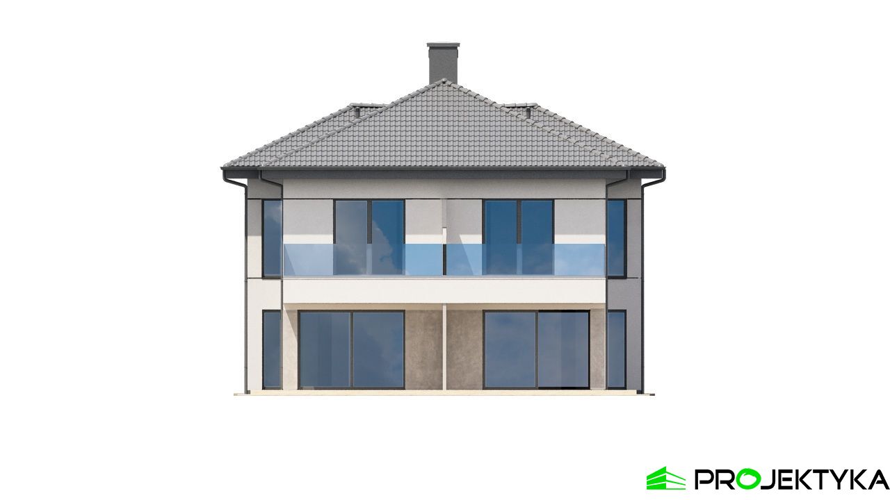Dom można wybudować na mniejszej, wąskiej działce o minimalnych wymiarach 16.88 m x 27.55 m. Taras o powierzchni 45,60 m² i duże przeszklenia w salonie pozwalają na pełne wykorzystanie naturalnego światła.