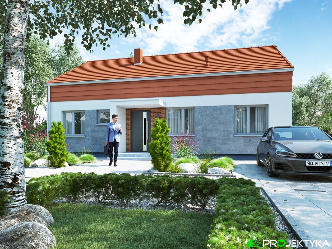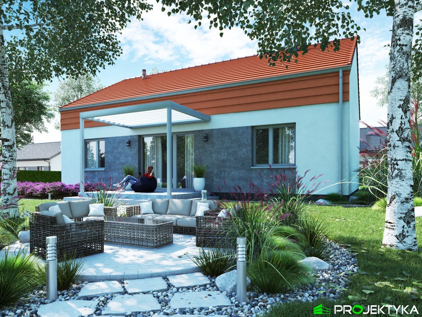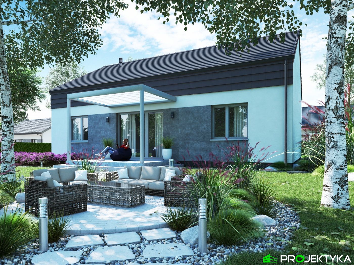Ka294 Sz to projekt domu parterowego, wykonany w technologii szkieletowej. Został stworzony z myślą o inwestorach poszukujących niewielkiego domu, oszczędnego w eksploatacji, ale ponadczasowo pięknego. Jego powierzchnia mieszkalna 90,91 m2 została zagospodarowana w bardzo ciekawy sposób. Ten projekt domu z dachem dwuspadowym posiada strych na poddaszu i niewielki taras na tyłach domu. Centralną część domu stanowi strefa dzienna – kuchnia z oknami od strony frontowej i przestronny salon z jadalnią. Pomimo stosunkowo niewielkiej powierzchni, to dom przeznaczony dla sporej rodziny, gdyż uwzględniono w nim aż cztery pokoje. Po lewej stronie domu znajdują się dwie sypialnie, WC oraz pomieszczenie gospodarcze, natomiast po prawej – łazienka, kolejna sypialnia i pokój, który można wykorzystać jako gabinet. Sposób usytuowania pomieszczeń sprawia, że ten jednorodzinny dom jest funkcjonalny i komfortowy w użytkowaniu.