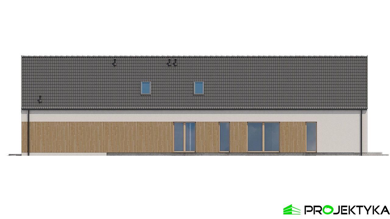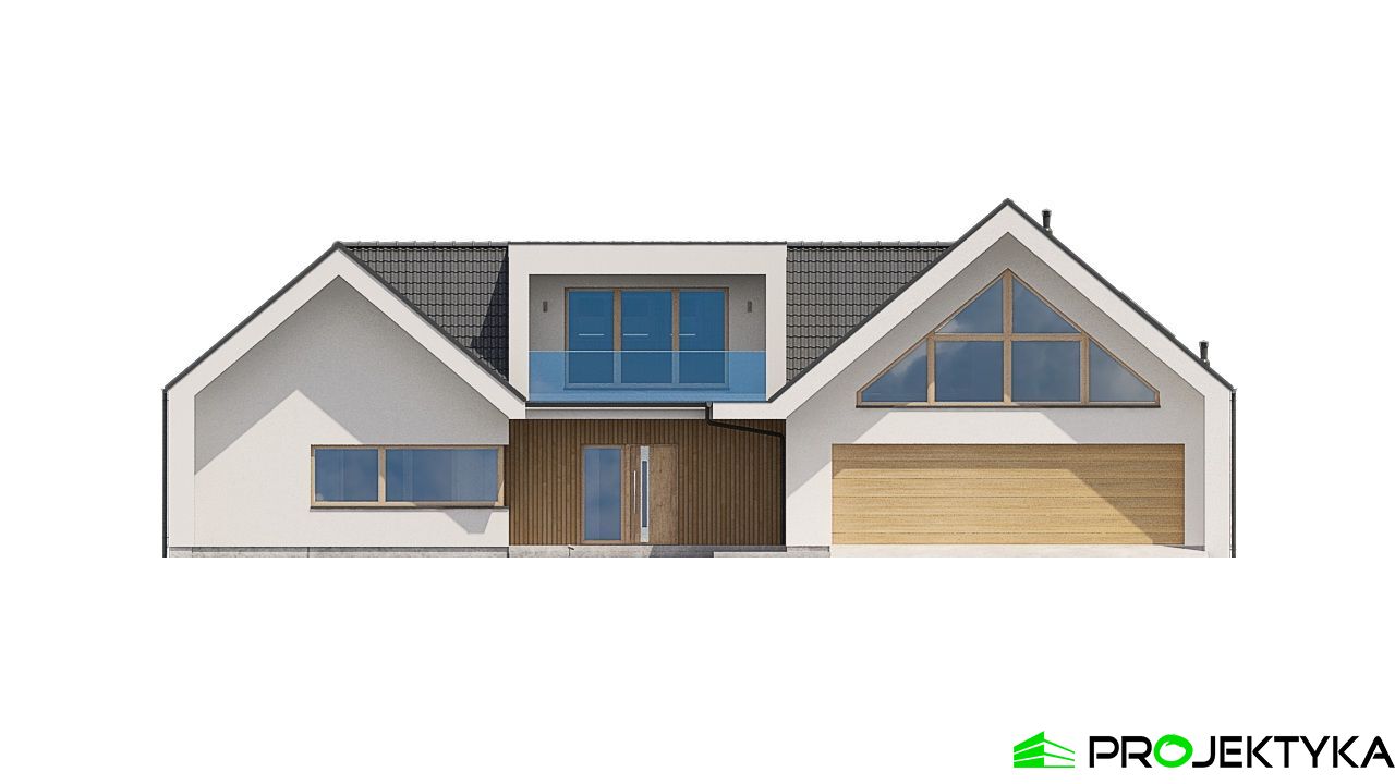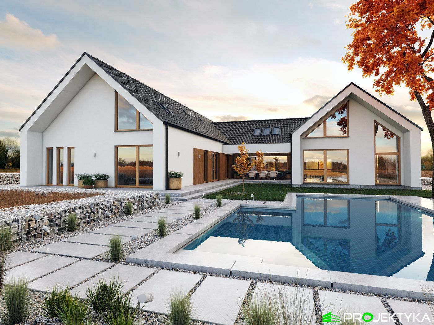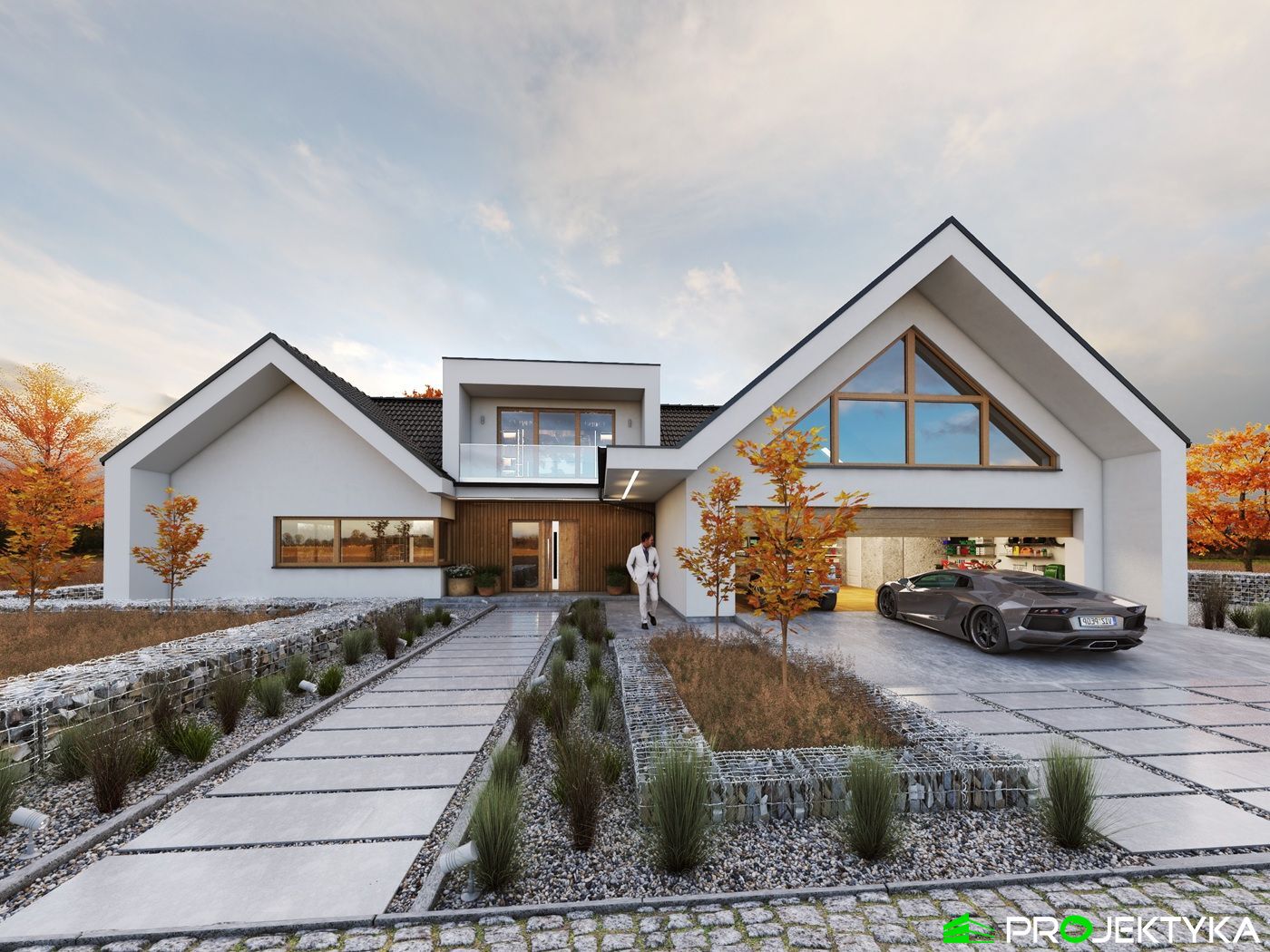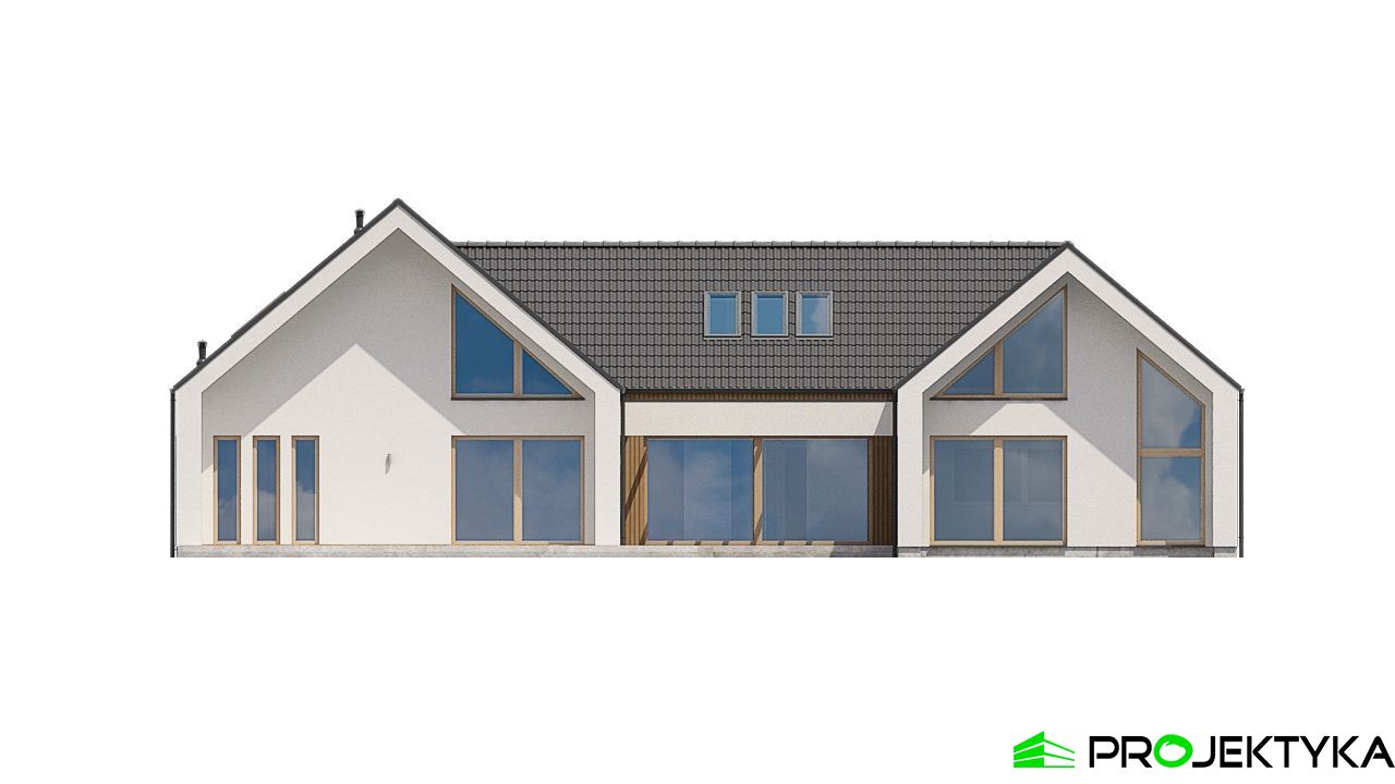Gotowy projekt domu Ka295 T to imponujący, nowoczesny dom o powierzchni mieszkalnej 383,5 m², zaprojektowany jako budynek parterowy z poddaszem użytkowym. Budynek ma efektowną, elegancką bryłę, dwuspadowy dach z kątem nachylenia 40°, dwustanowiskowy garaż i zaprojektowany jest technologii murowanej.
