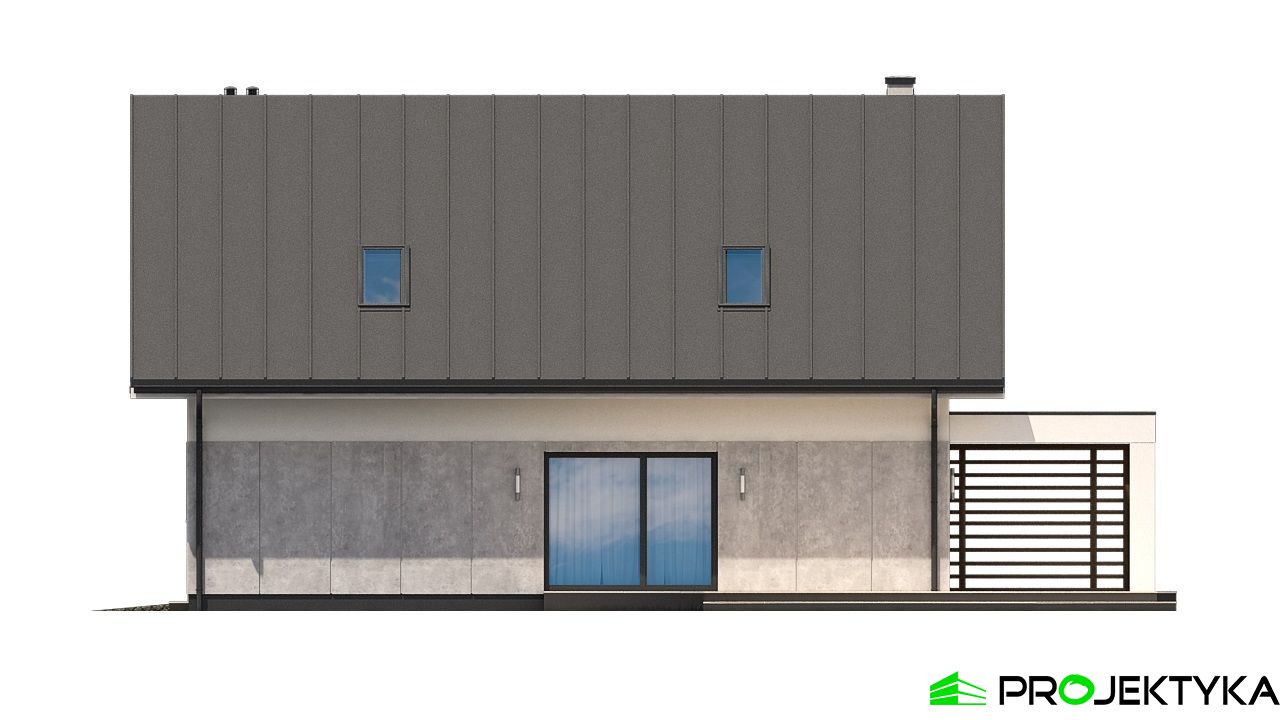 Gotowy projekt domu nowoczesnego w strefie dziennej wyróżnia półotwartą kuchnię wyposażoną w spiżarnię. Dodatkowo jadalnia połączona z salonem i bezpośrednim wyjściem na taras daje wrażenie nieograniczonej przestrzeni. Ponadto dużym atutem będzie dodatkowy pokój dla gości, który może służyć również, jako gabinet. Komfortowym i praktycznym rozwiązaniem jest pomieszczenie gospodarcze, które pozwoli nam na przechowywanie narzędzi ogrodniczych, rowerów oraz innych przedmiotów codziennego użytku.